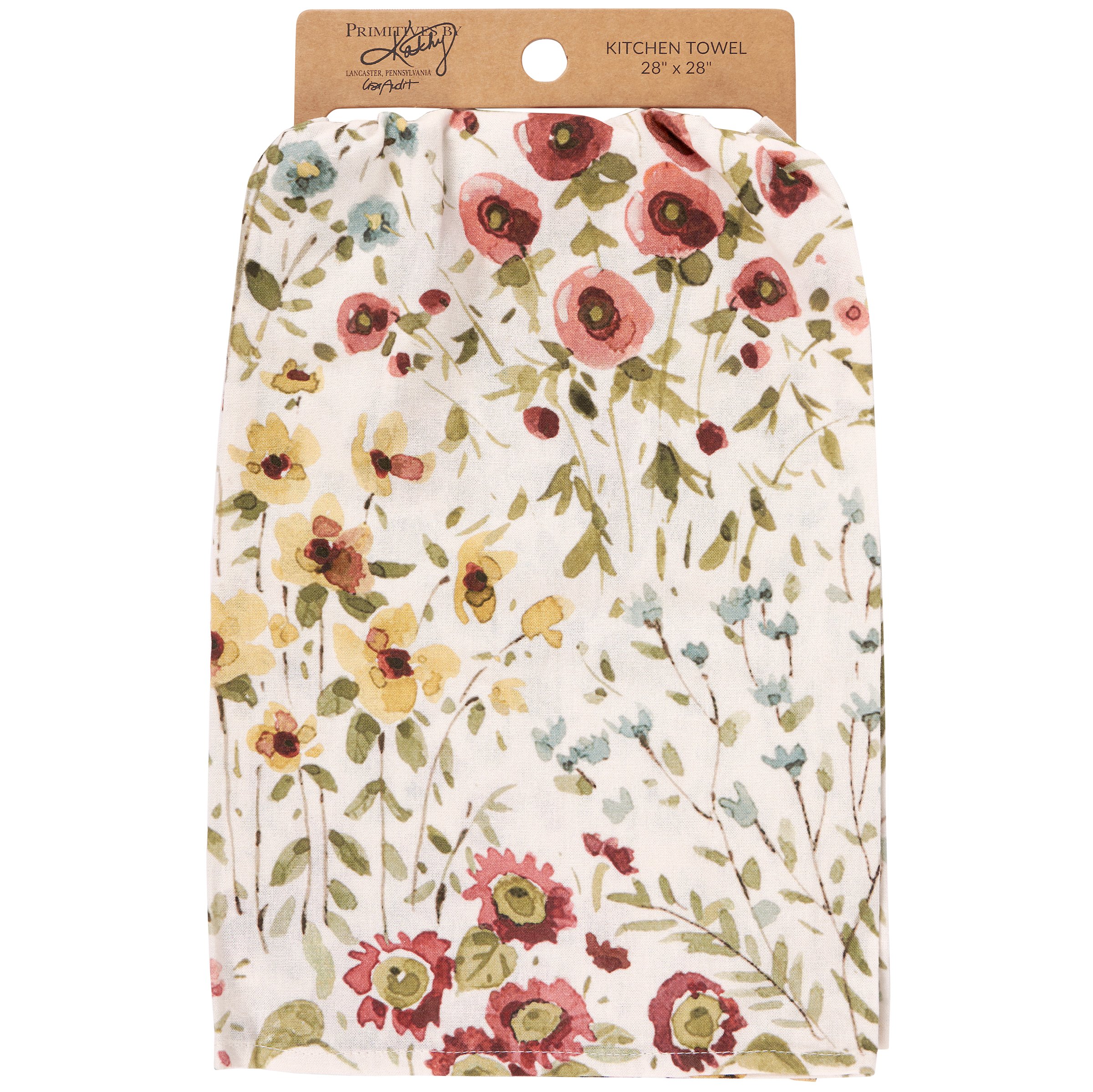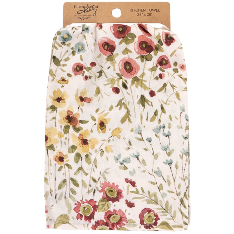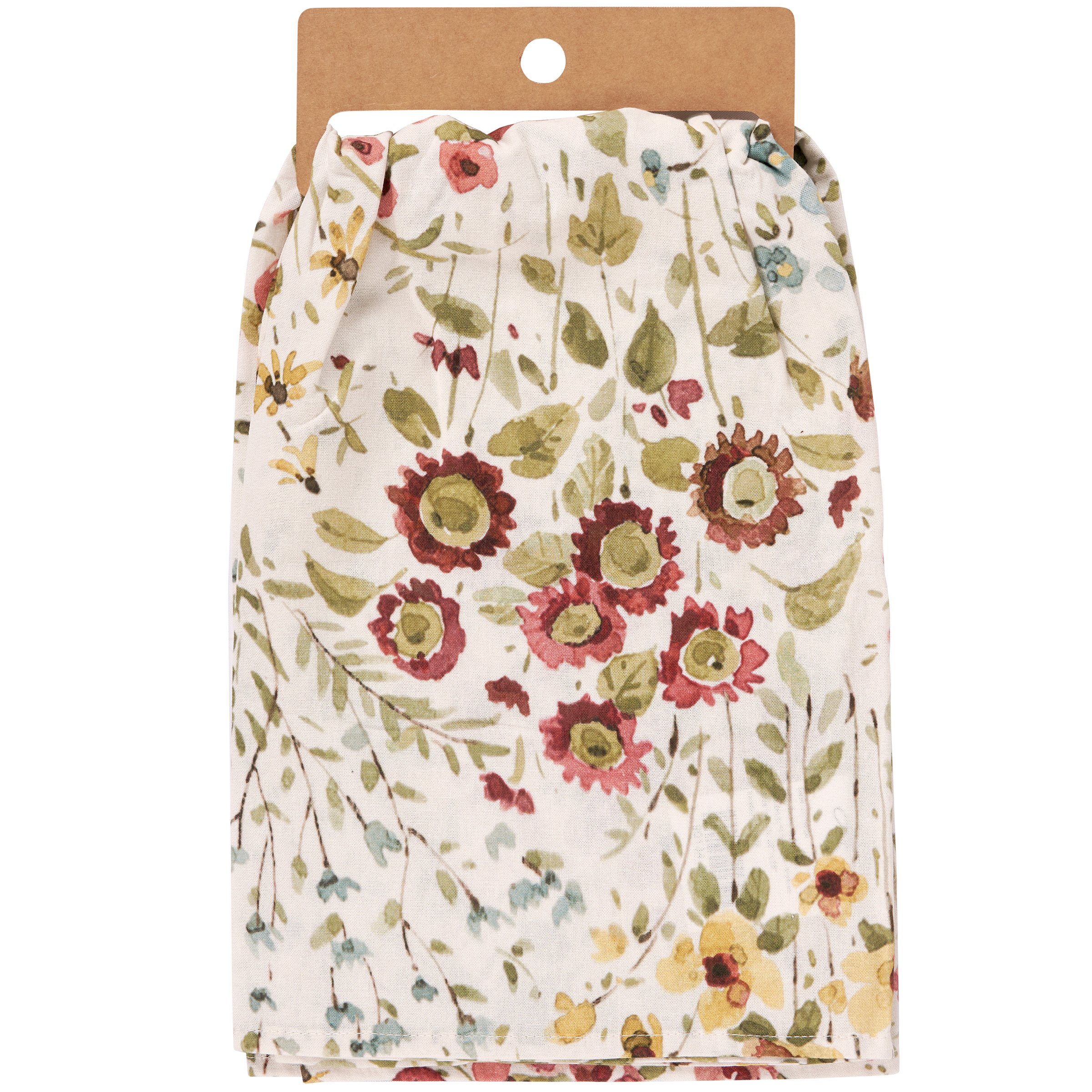 A cotton kitchen towel from our Fall & Harvest Collection displaying an all-over design of fall wildflowers replicated from original art hand painted in a delicate watercolor style. Our Fall Wildflowers kitchen towel is conveniently machine-washable for easy cleaning. Seasonal kitchen towel is packaged on a cardboard hanger with hole to easily display on rack. A rustic fall-themed kitchen accessory perfect for seasonal use.