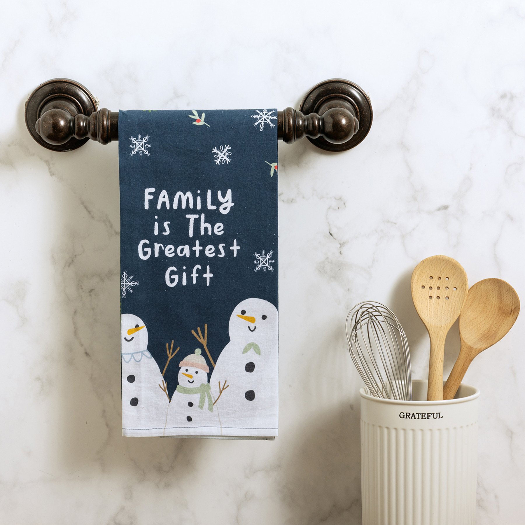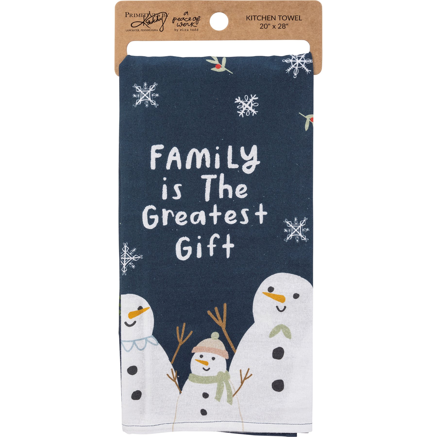 A blue cotton kitchen towel featuring a "Family Is The Greatest Gift" sentiment, snowmen designs, and all-over holly branch and snowflake designs. Our Greatest Gift kitchen towel is machine-washable. Towel is packaged on a cardboard hanger with a hole to easily hang on rack.