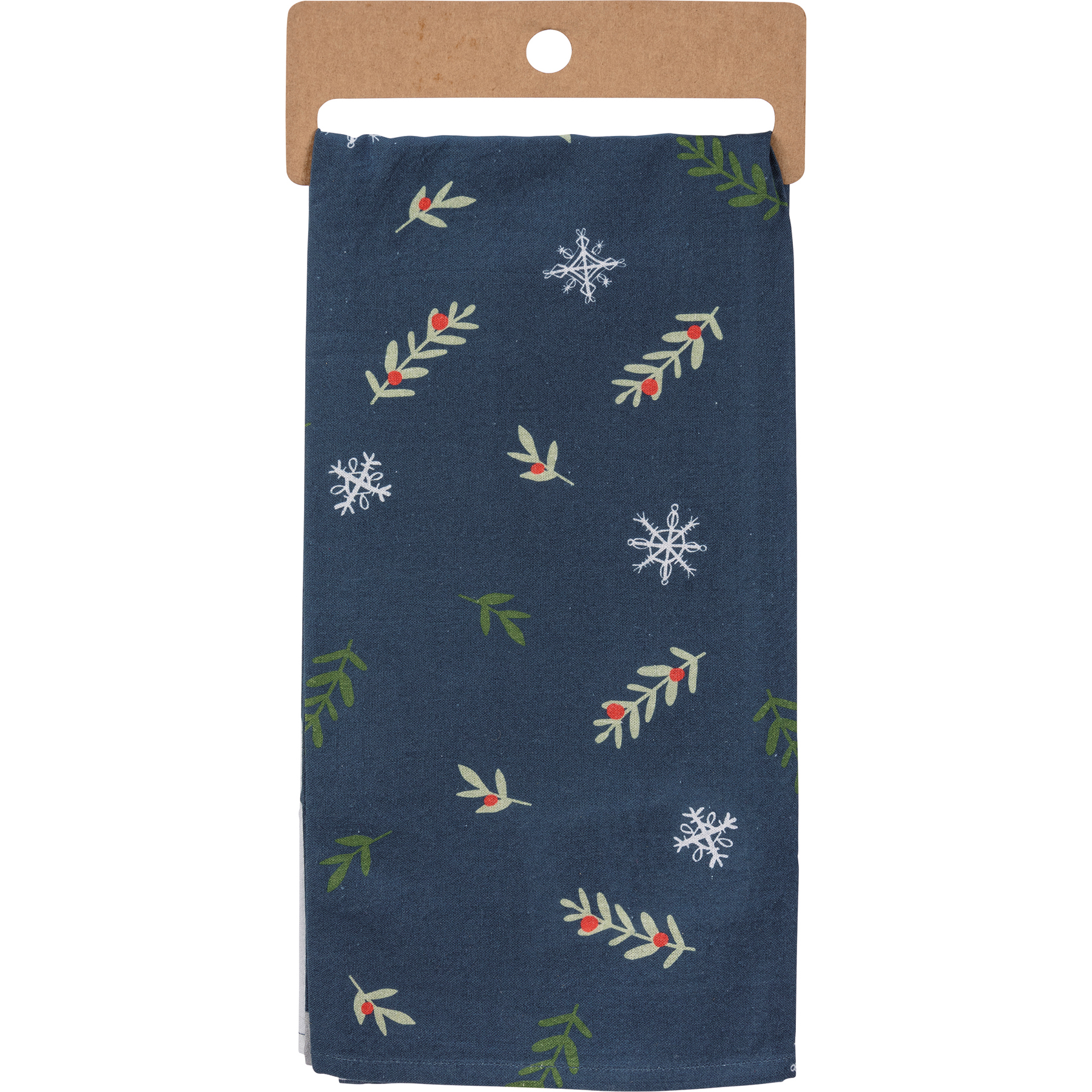 A blue cotton kitchen towel featuring a "Family Is The Greatest Gift" sentiment, snowmen designs, and all-over holly branch and snowflake designs. Our Greatest Gift kitchen towel is machine-washable. Towel is packaged on a cardboard hanger with a hole to easily hang on rack.