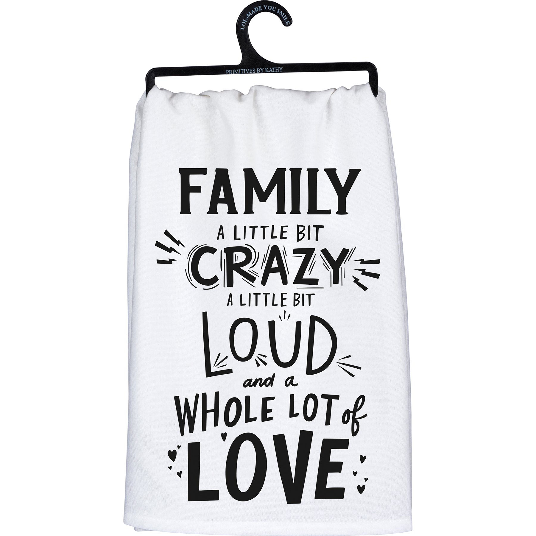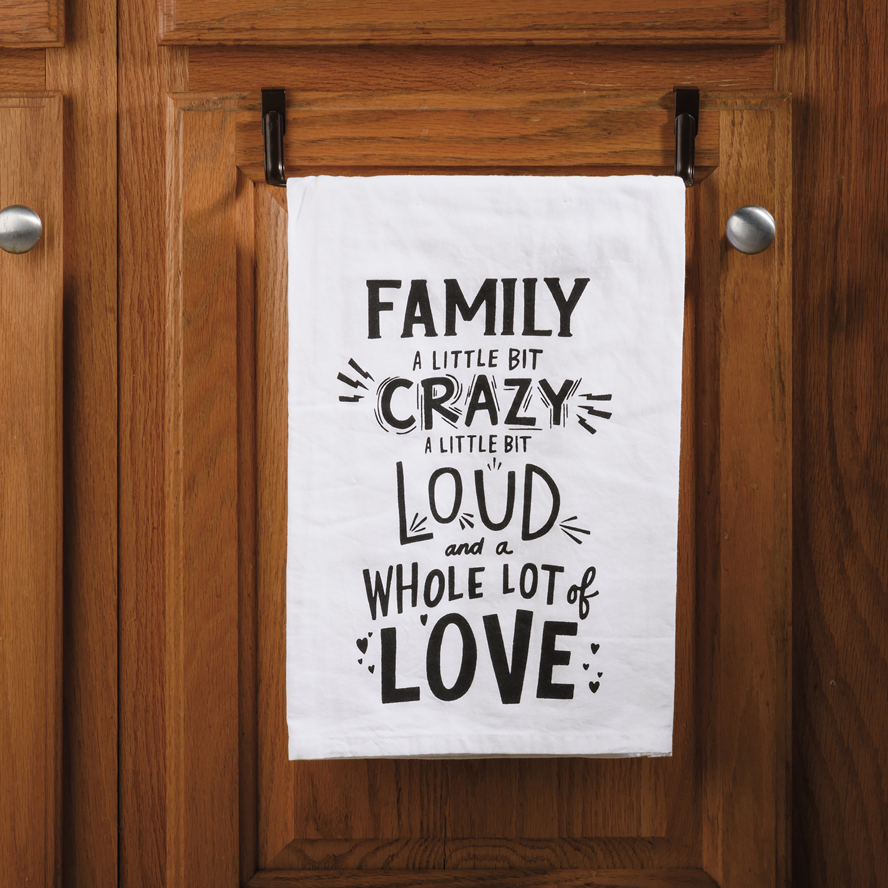 A black and white cotton kitchen towel featuring "Family A Little Bit Crazy A Little Bit Loud And A Whole Lot Of Love" sentiment. Machine-washable.