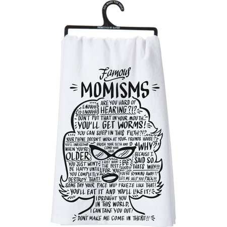 A cotton kitchen towel lending "Famous Momisms" sentiment with character outline filled with several mom-like phrases that complements well with existing kitchen decor. Machine-washable.