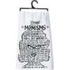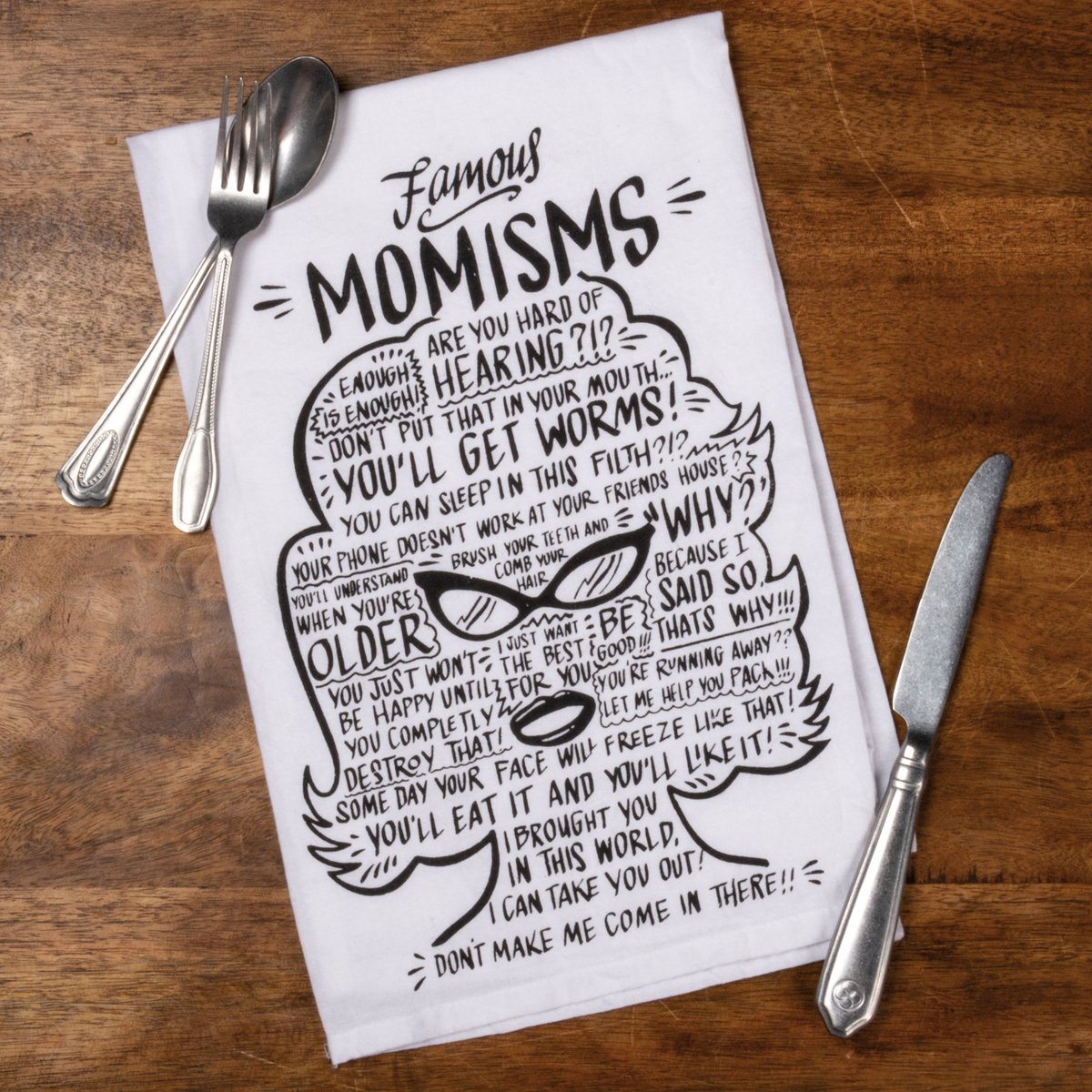 A cotton kitchen towel lending "Famous Momisms" sentiment with character outline filled with several mom-like phrases that complements well with existing kitchen decor. Machine-washable.