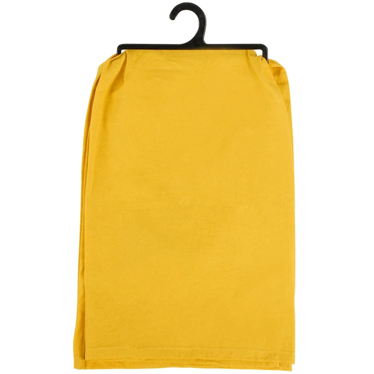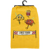 A yellow cotton kitchen towel from our LOL-Made You Smile Collection displaying hand illustrated designs of fast food characters racing each other in a fun retro style with a finish line banner that reads "Fast Food Tasty Race." Our Fast Food Tasty Race kitchen towel is conveniently machine-washable for easy cleaning. Retro kitchen towel is packaged on a black plastic hanger to easily display on rack. A fun food-themed gift perfect for a retro kitchen accessory.