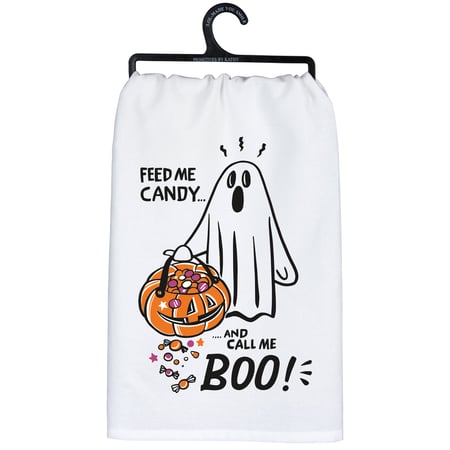 A white cotton kitchen towel from our Halloween Collection displaying a colorful hand illustrated design of a sheet ghost holding a treat bucket full of candy with a fun ghost-themed sentiment that reads "Feed Me Candy... And Call Me Boo!" Our Feed Me Candy kitchen towel is conveniently machine-washable for easy cleaning. Seasonal kitchen towel is packaged on a black plastic hanger to easily display on rack. A fun Halloween kitchen accessory perfect for seasonal use.