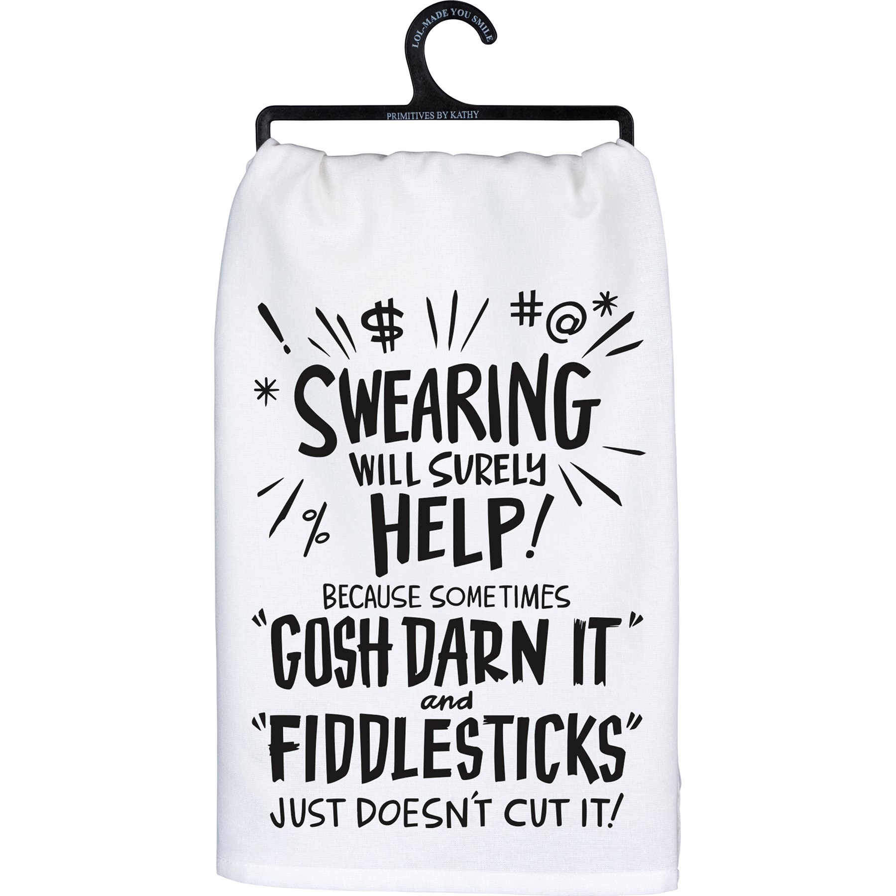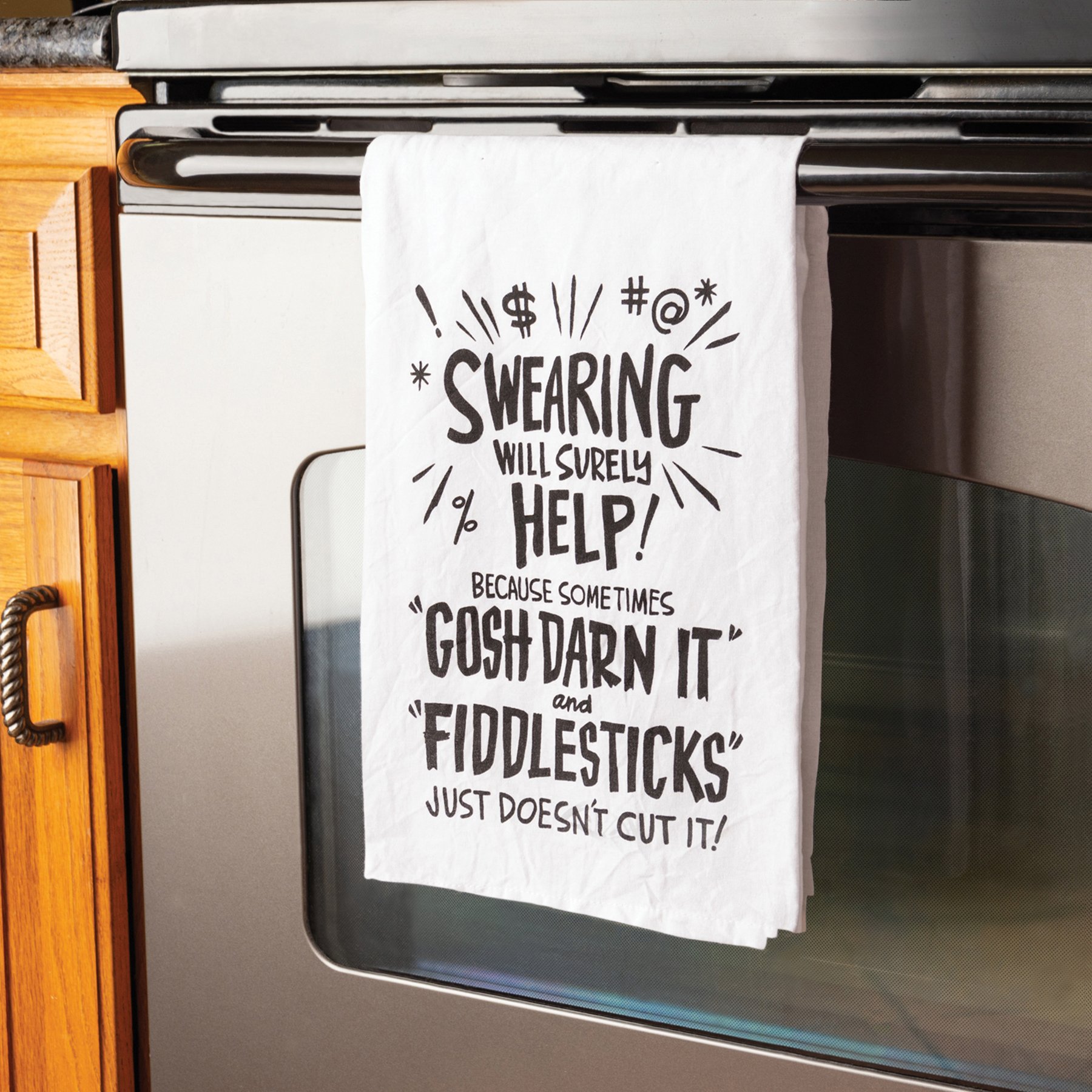 A cotton kitchen towel featuring expletive sign designs with hand lettered "Swearing Will Surely Help! Because Sometimes 'Gosh Darn It' And 'Fiddlesticks' Just Doesn't Cut It" sentiment. Our Fiddlesticks Just Doesn't Cut It kitchen towel is machine-washable.