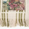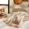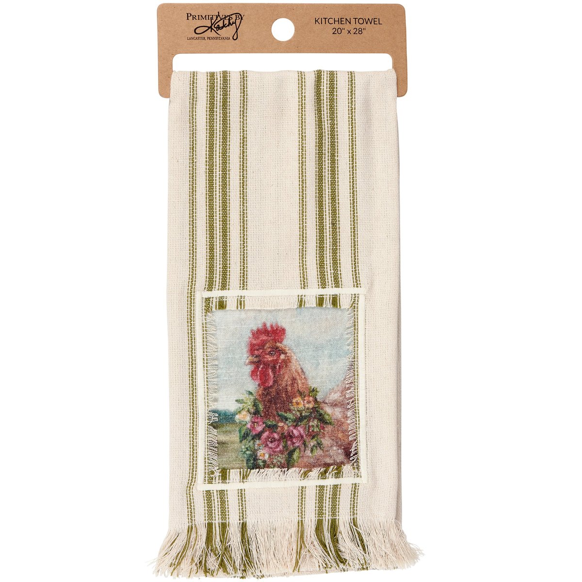 A cream cotton kitchen towel from our Easter & Spring Collection featuring a stitched art panel with frayed border and woven green stripe designs throughout. Design displays a farm chicken wearing a wreath of vibrant spring flowers replicated from original artwork painted onto burlap canvas, giving the art a unique depth and texture. Our Floral Chicken kitchen towel is machine-washable for convenient cleaning. Packaged on a cardboard hanger with hole to easily display on rack. A rustic spring-themed kitchen accessory perfect for everyday use.