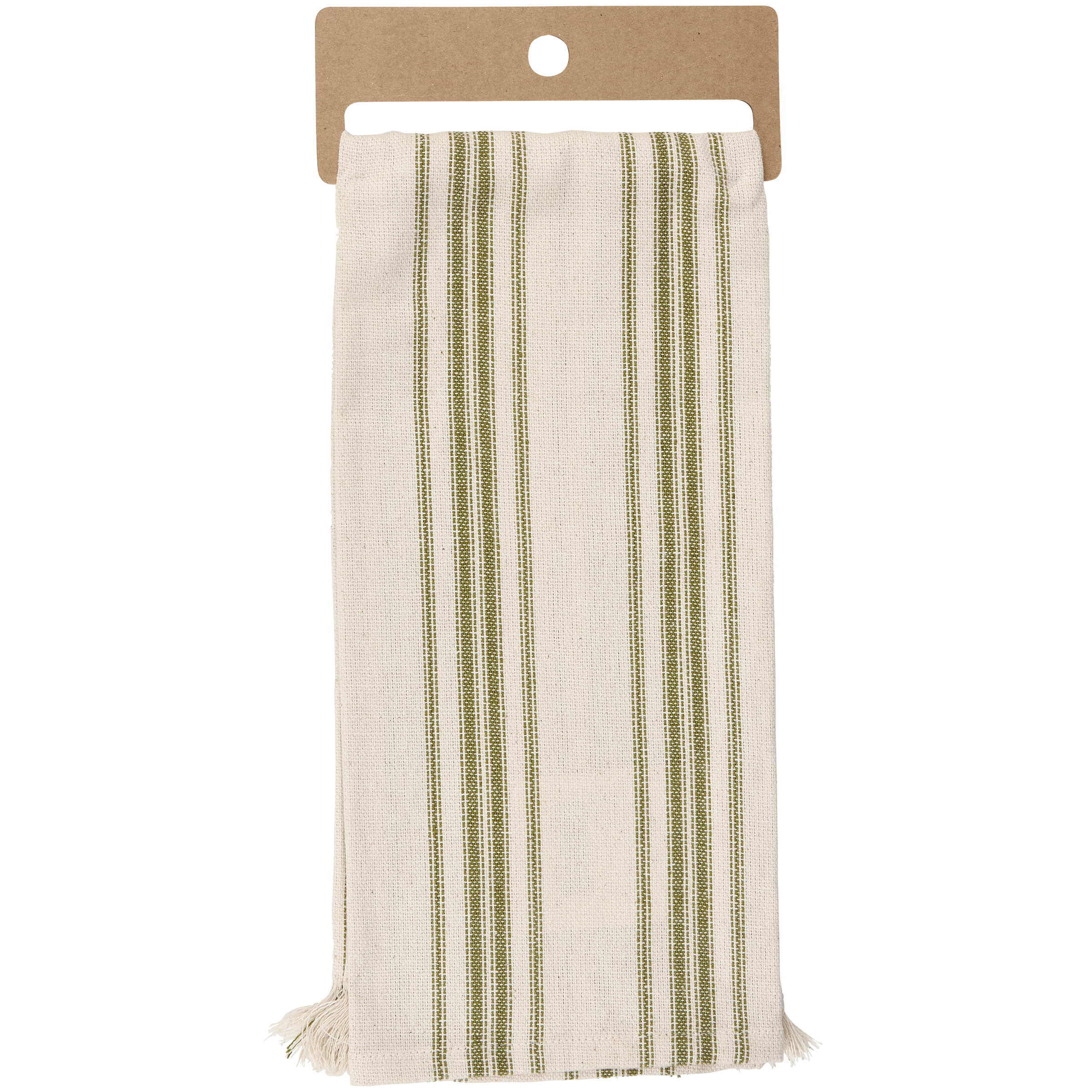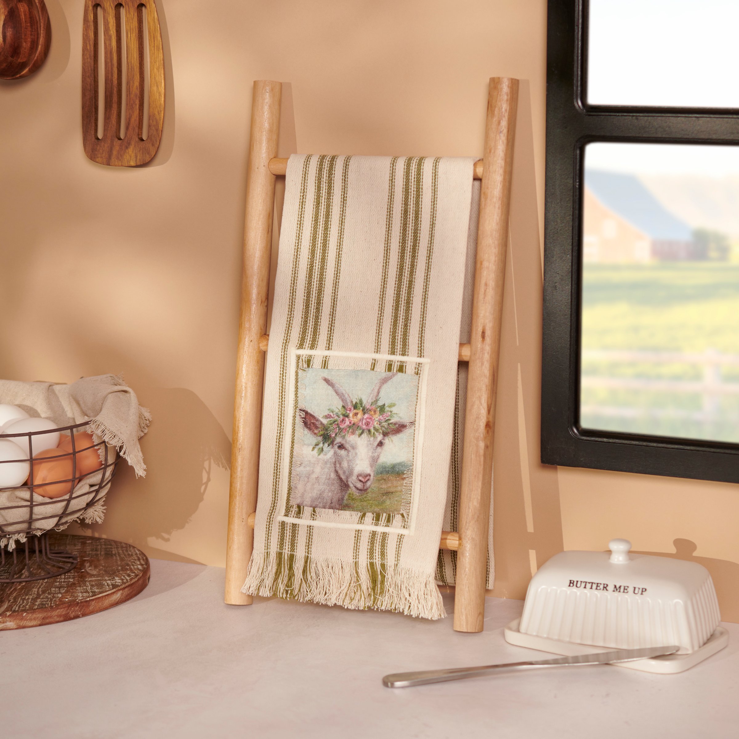 A cream cotton kitchen towel from our Easter & Spring Collection featuring a stitched art panel with frayed border and woven green stripe designs throughout. Design displays a farm goat wearing a crown of vibrant spring flowers replicated from original artwork painted onto burlap canvas, giving the art a unique depth and texture. Our Floral Crown Goat kitchen towel is machine-washable for convenient cleaning. Packaged on a cardboard hanger with hole to easily display on rack. A rustic spring-themed kitchen accessory perfect for everyday use.