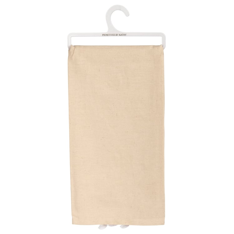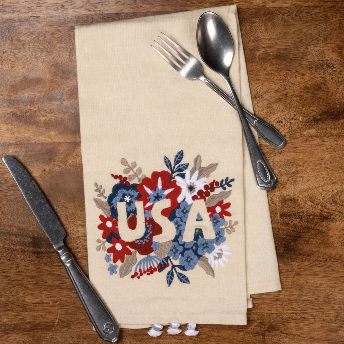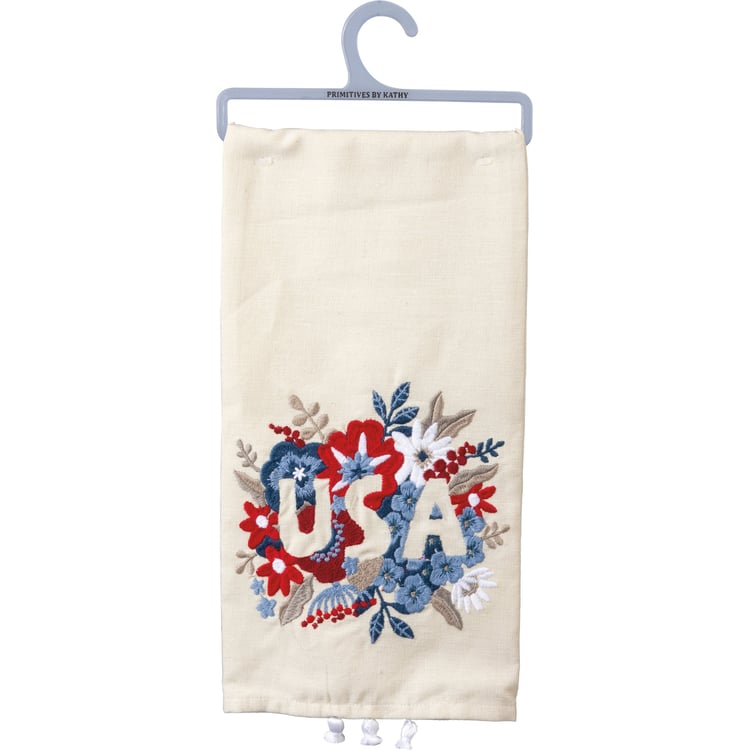 A cotton and linen kitchen towel featuring an embroidered "USA" sentiment, floral designs, and tassel trim details. Machine-washable.
