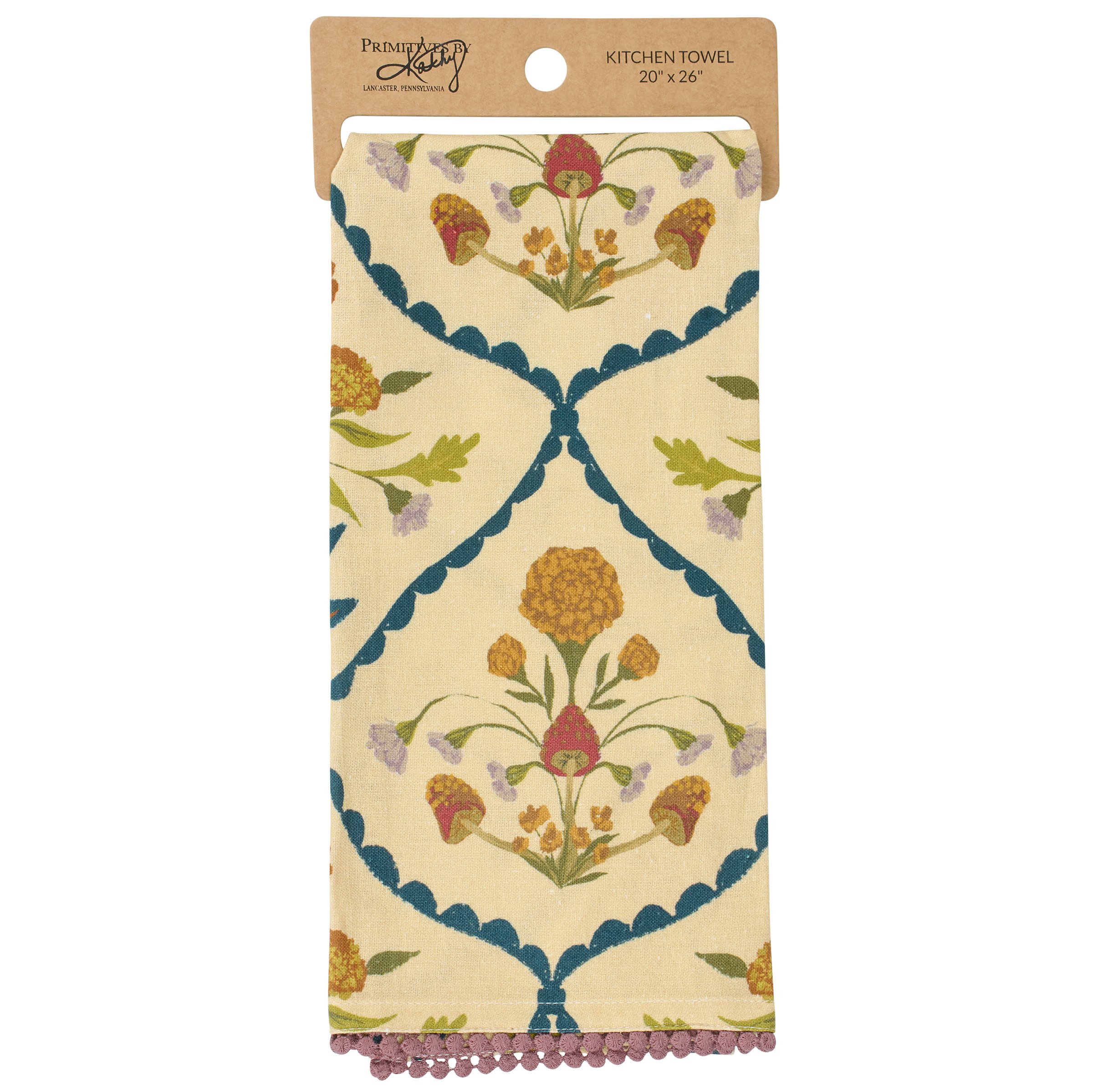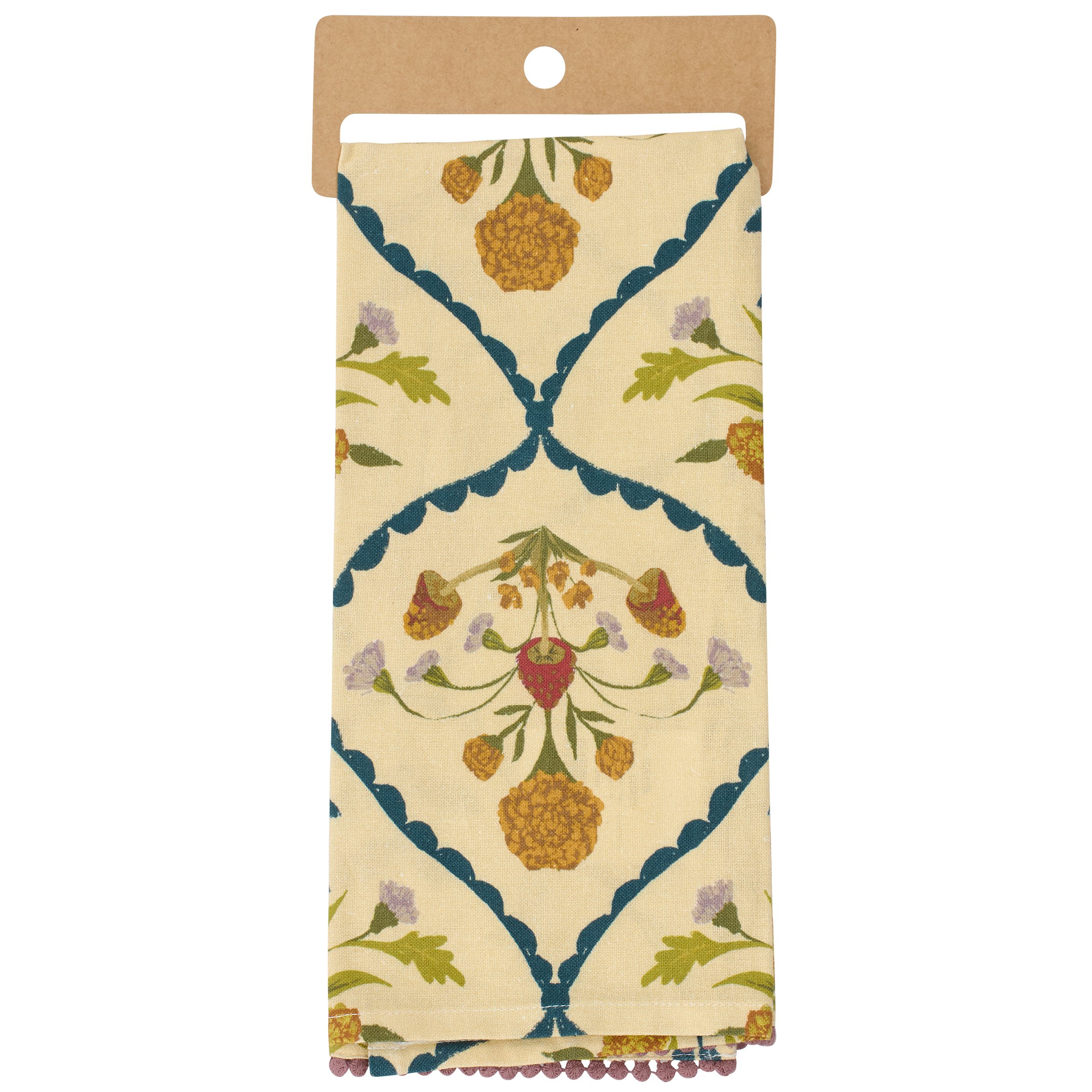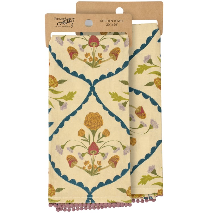 A cotton-linen blend kitchen towel from our Fall & Harvest Collection featuring an all-over design displaying a diamond pattern of folk art inspired fall florals with a purple pom trim at the bottom of the towel. Folk art florals design is replicated from original art hand painted in a unique watercolor style. Our Folk Diamond Floral kitchen towel is conveniently machine washable for easy cleaning. Seasonal kitchen towel is packaged on a cardboard hanger with hole to easily hang on rack. A folk fall kitchen accessory perfect for adding seasonal style to any kitchen.
