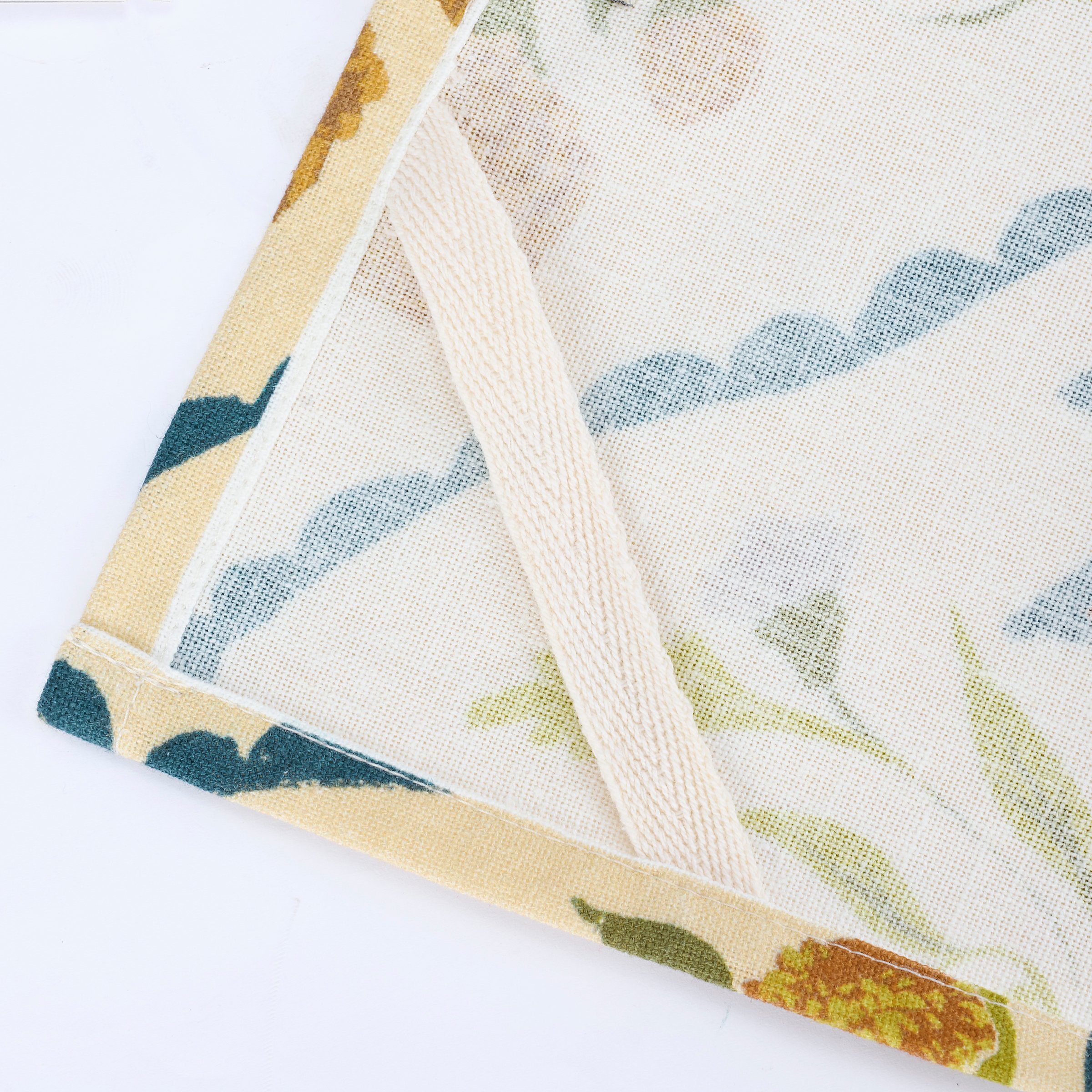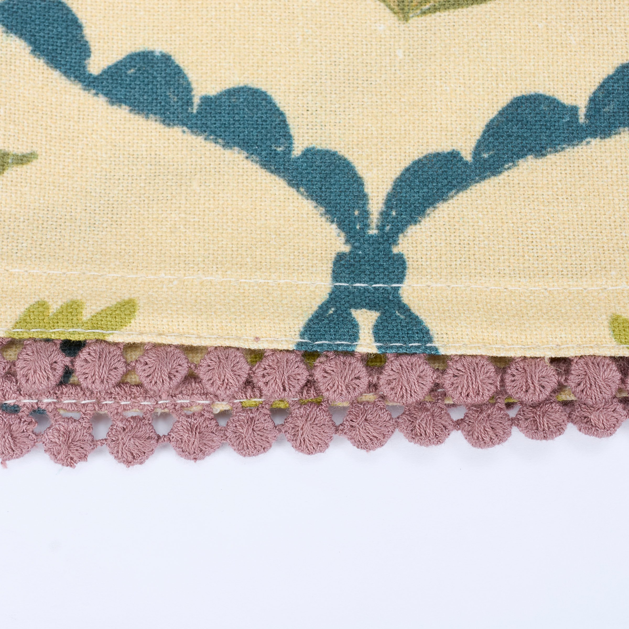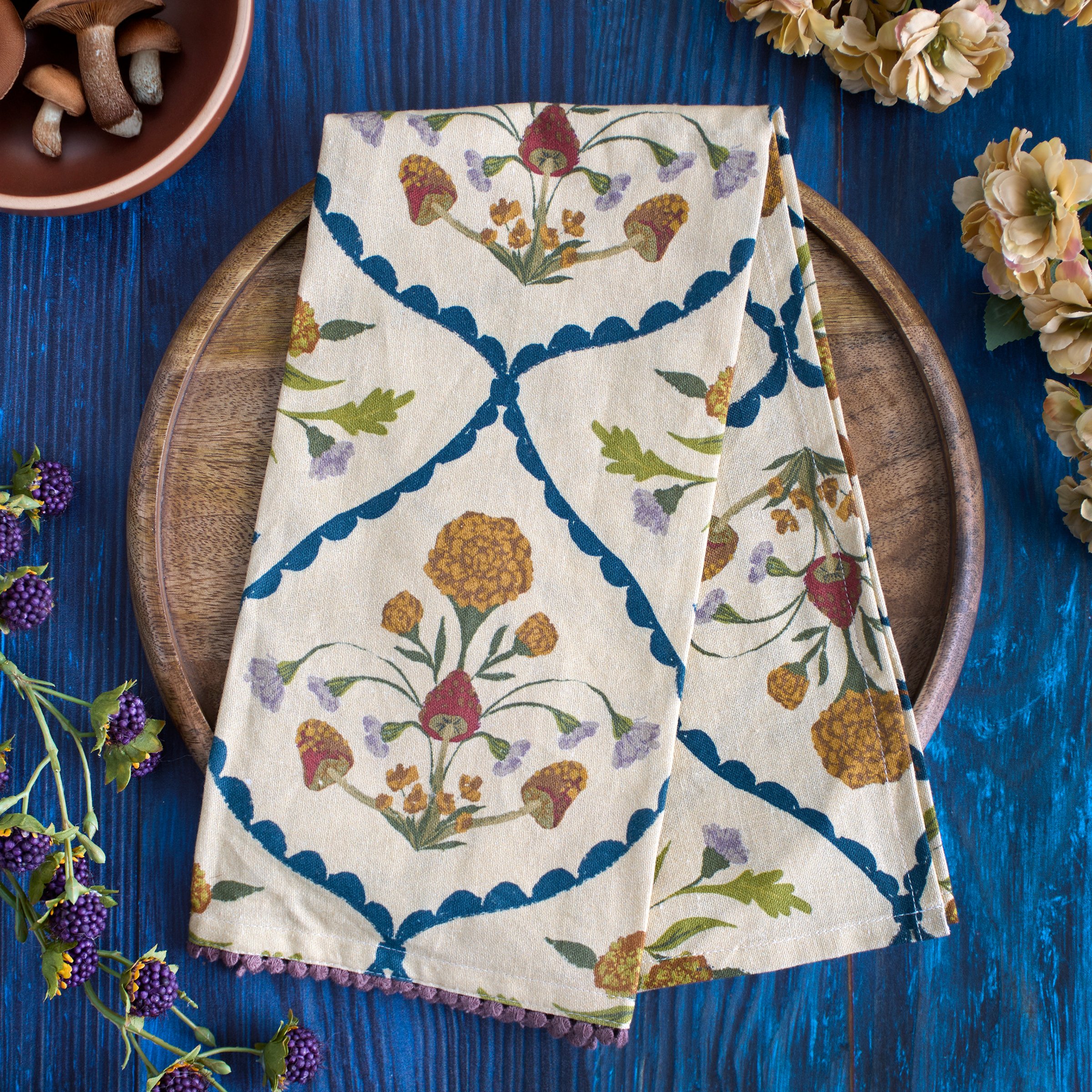 A cotton-linen blend kitchen towel from our Fall & Harvest Collection featuring an all-over design displaying a diamond pattern of folk art inspired fall florals with a purple pom trim at the bottom of the towel. Folk art florals design is replicated from original art hand painted in a unique watercolor style. Our Folk Diamond Floral kitchen towel is conveniently machine washable for easy cleaning. Seasonal kitchen towel is packaged on a cardboard hanger with hole to easily hang on rack. A folk fall kitchen accessory perfect for adding seasonal style to any kitchen.
