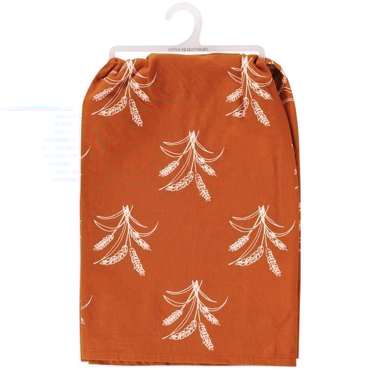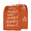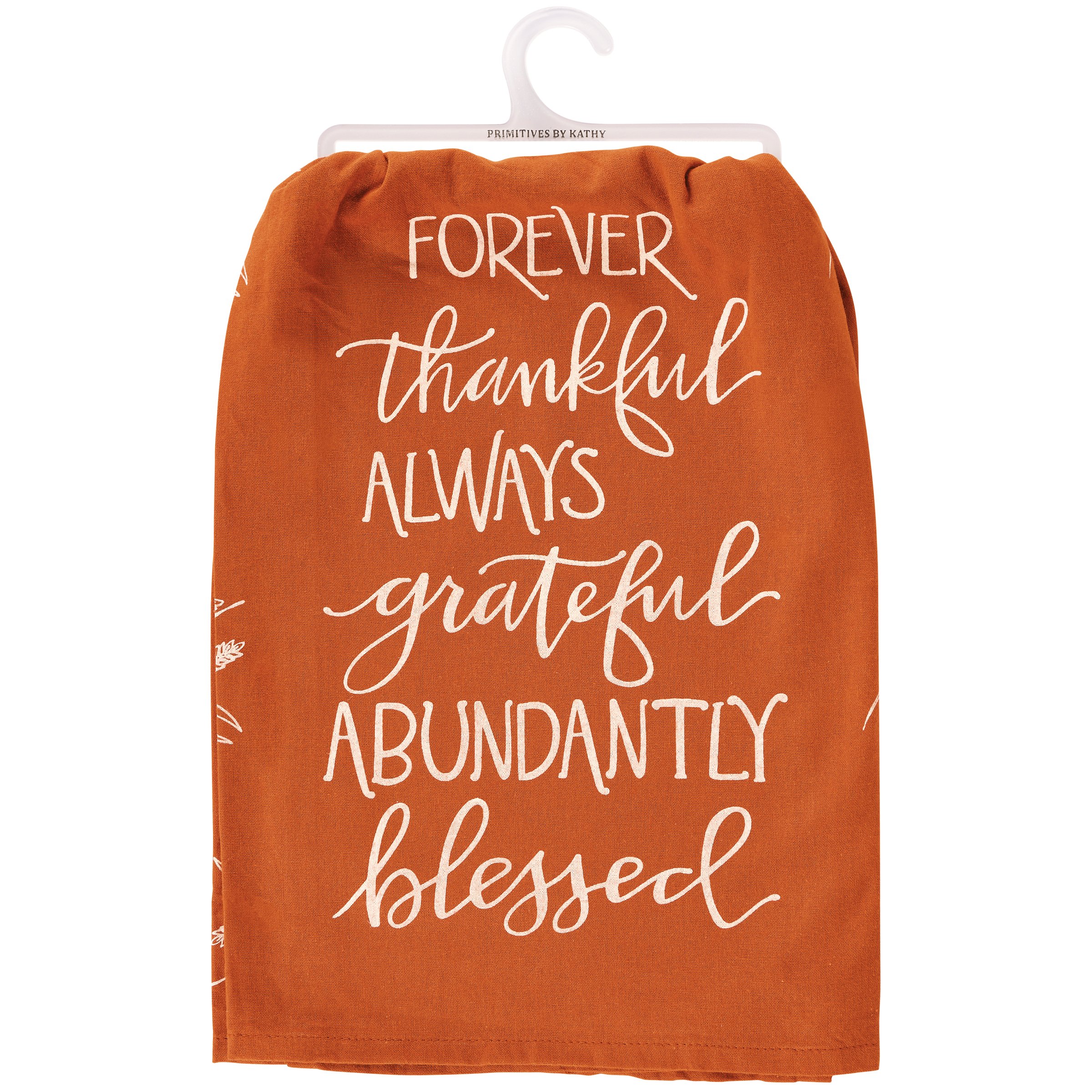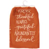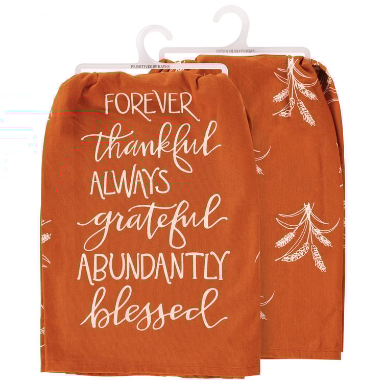 A fall orange cotton kitchen towel from our Fall & Harvest Collection displaying an all-over design of harvest plants with an inspirational fall sentiment in a hand illustrated style that reads "Forever Thankful - Always Grateful - Abundantly Blessed." Our Forever Thankful kitchen towel is conveniently machine-washable for easy cleaning. Seasonal kitchen towel is packaged on a clear plastic hanger to easily display on rack. An inspirational fall kitchen accessory perfect for seasonal use.