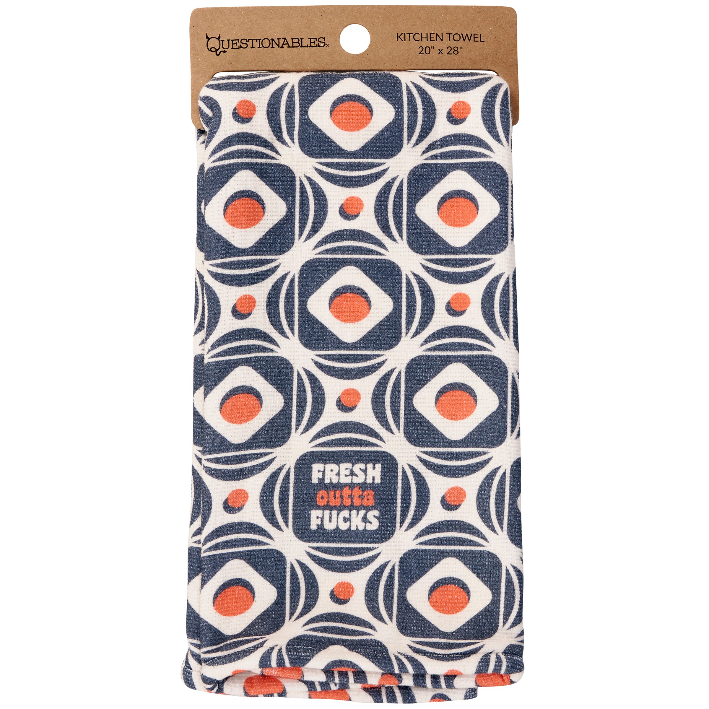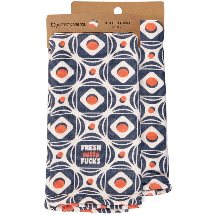 Oh, sorry. Just ran out... try again tomorrow. This super-soft cotton kitchen towel flaunts a stylish retro inspired pattern with a sassy sentiment that reads "Fresh Outta Fucks." Fold to display the retro pattern for the timid guests or flip to display the relatable sentiment for the more hardcore friends. Questionables kitchen towel features an absorbent terrycloth layer on the back to soak up whatever you throw at it. Machine-washable for stress-free cleaning. Packaged on a cardboard hanger with a hole to beautifully display on rack. Our Fresh kitchen towel calls back to a retro style while also calling out a modern mentality, perfect for everyday expression or gifting to like-minded friends.
