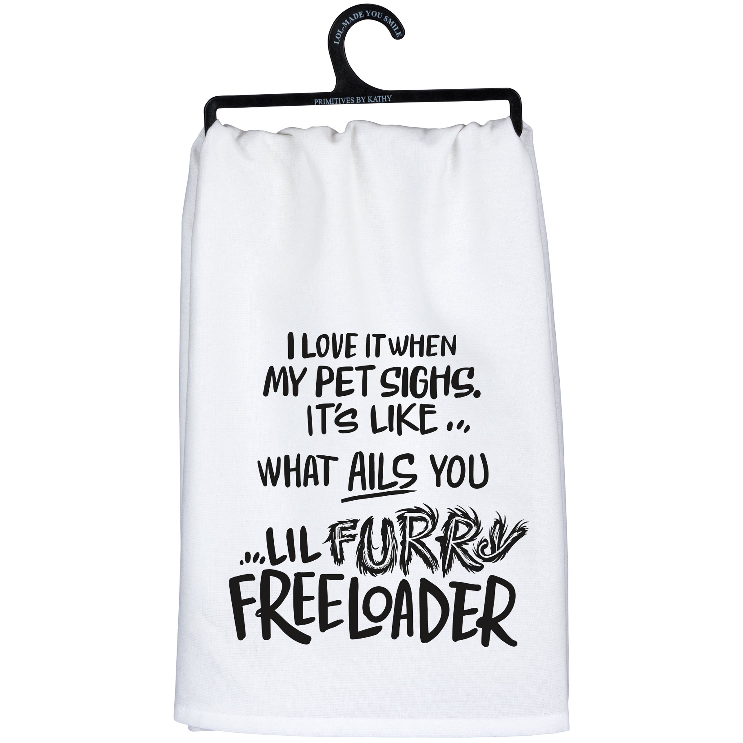 A black and white cotton kitchen towel from our Pet Collection displaying a sassy pet themed sentiment in a playful hand illustrated style that reads "I Love It When My Pet Sighs. It's Like... What Ails You Lil Furry Freeloader." Our Furry Freeloader kitchen towel is conveniently machine-washable for easy cleaning. This funny kitchen towel is packaged on a black plastic hanger to easily display on rack. A fun pet themed gift perfect for adding personality to any kitchen while showing off a love for pets.