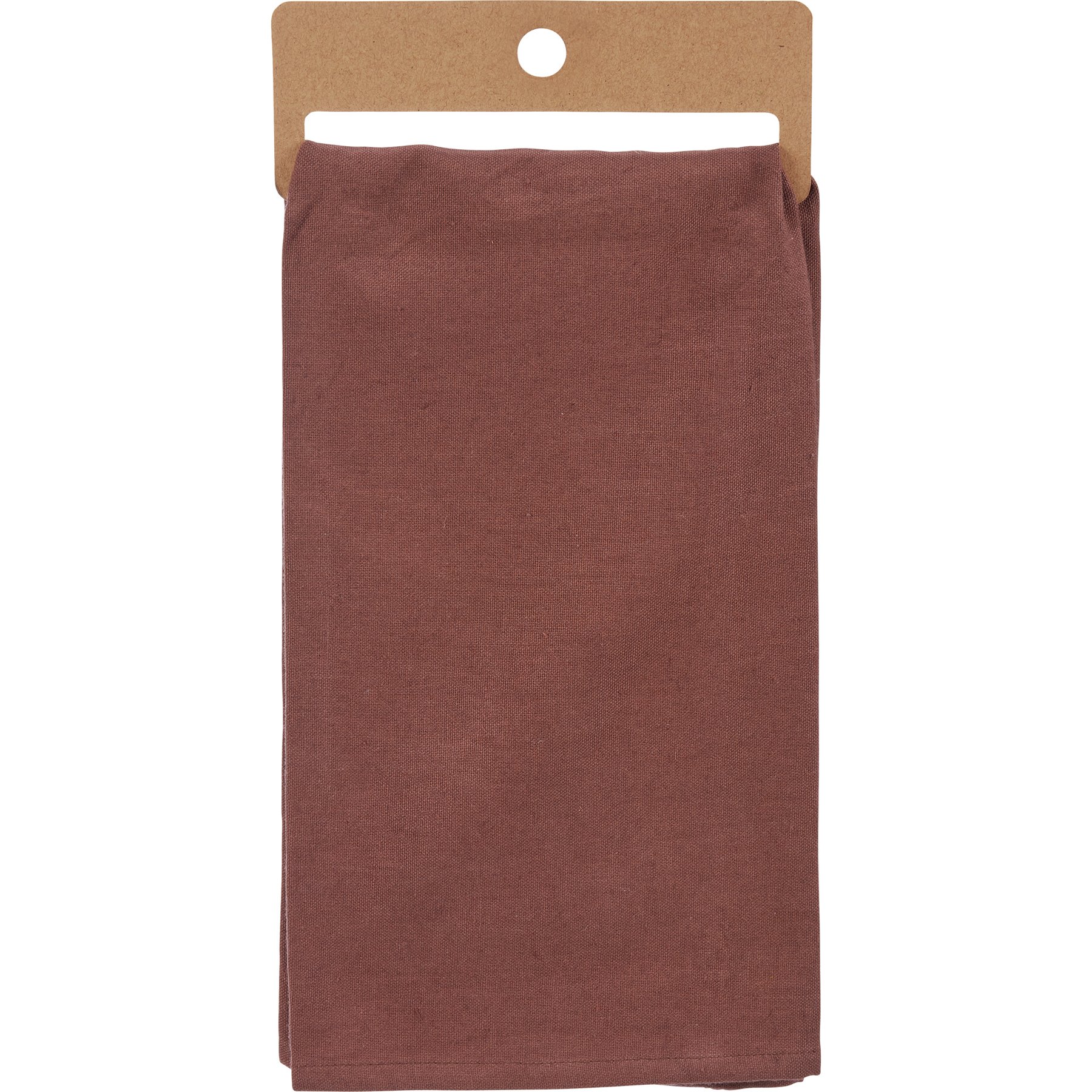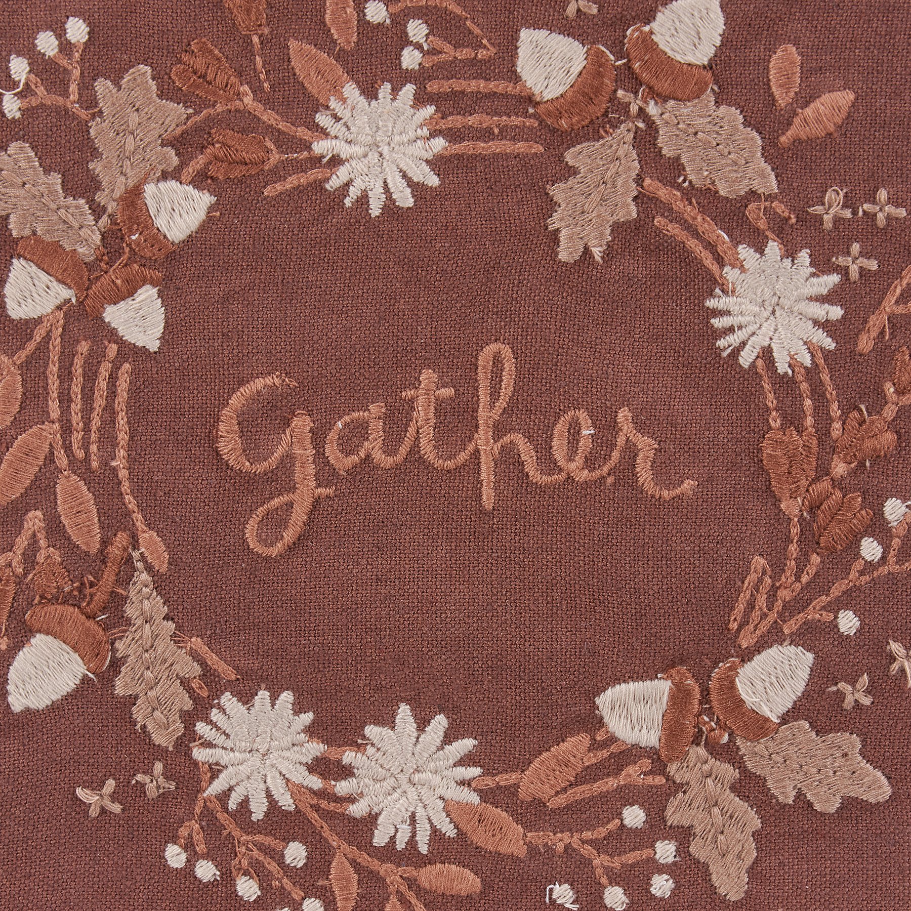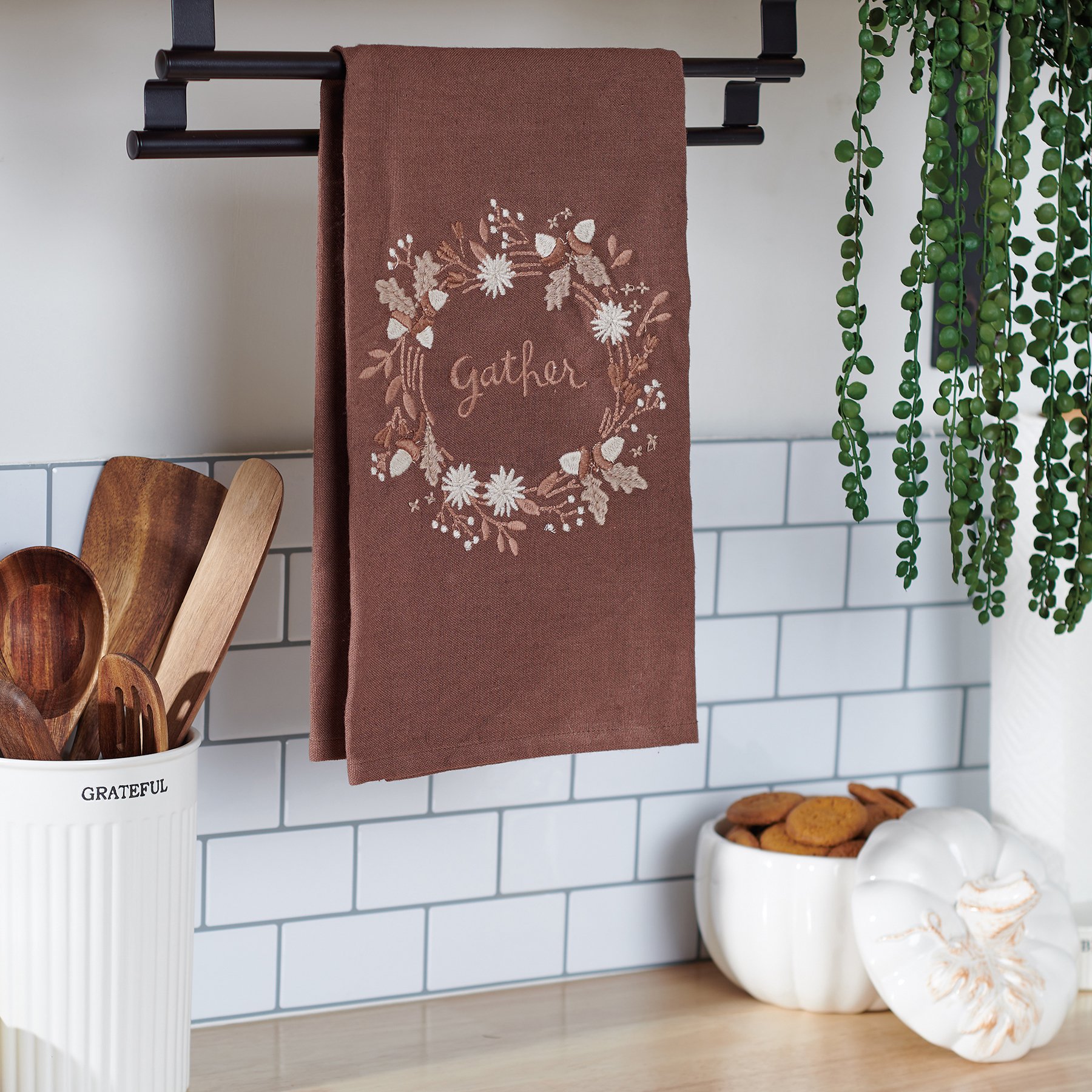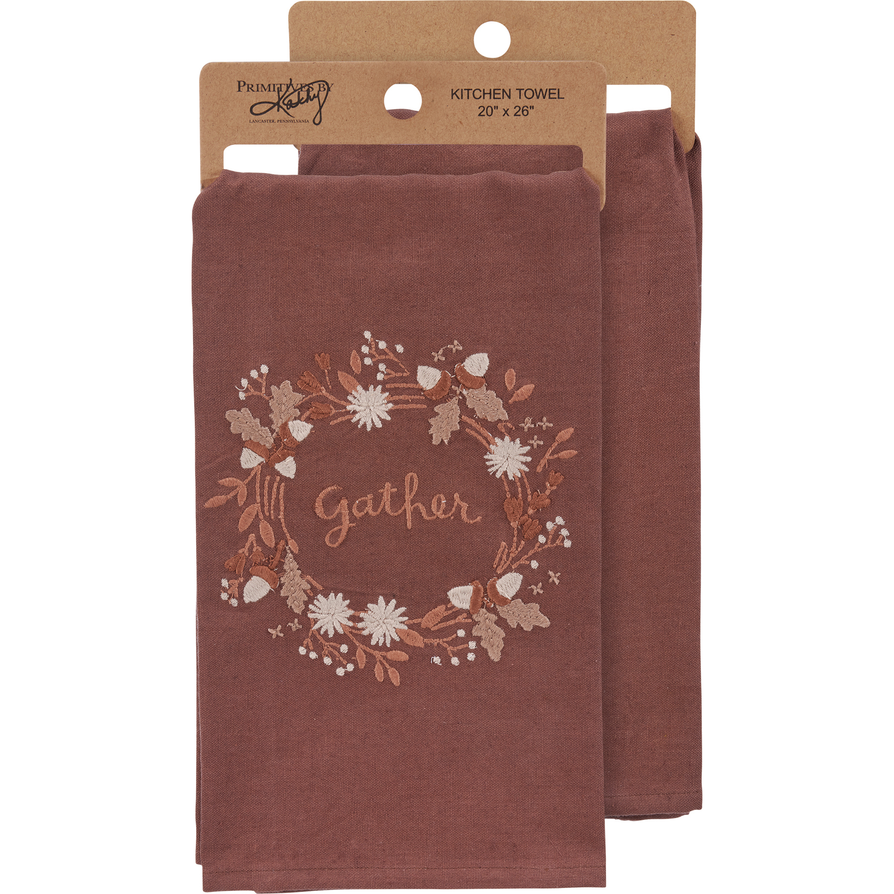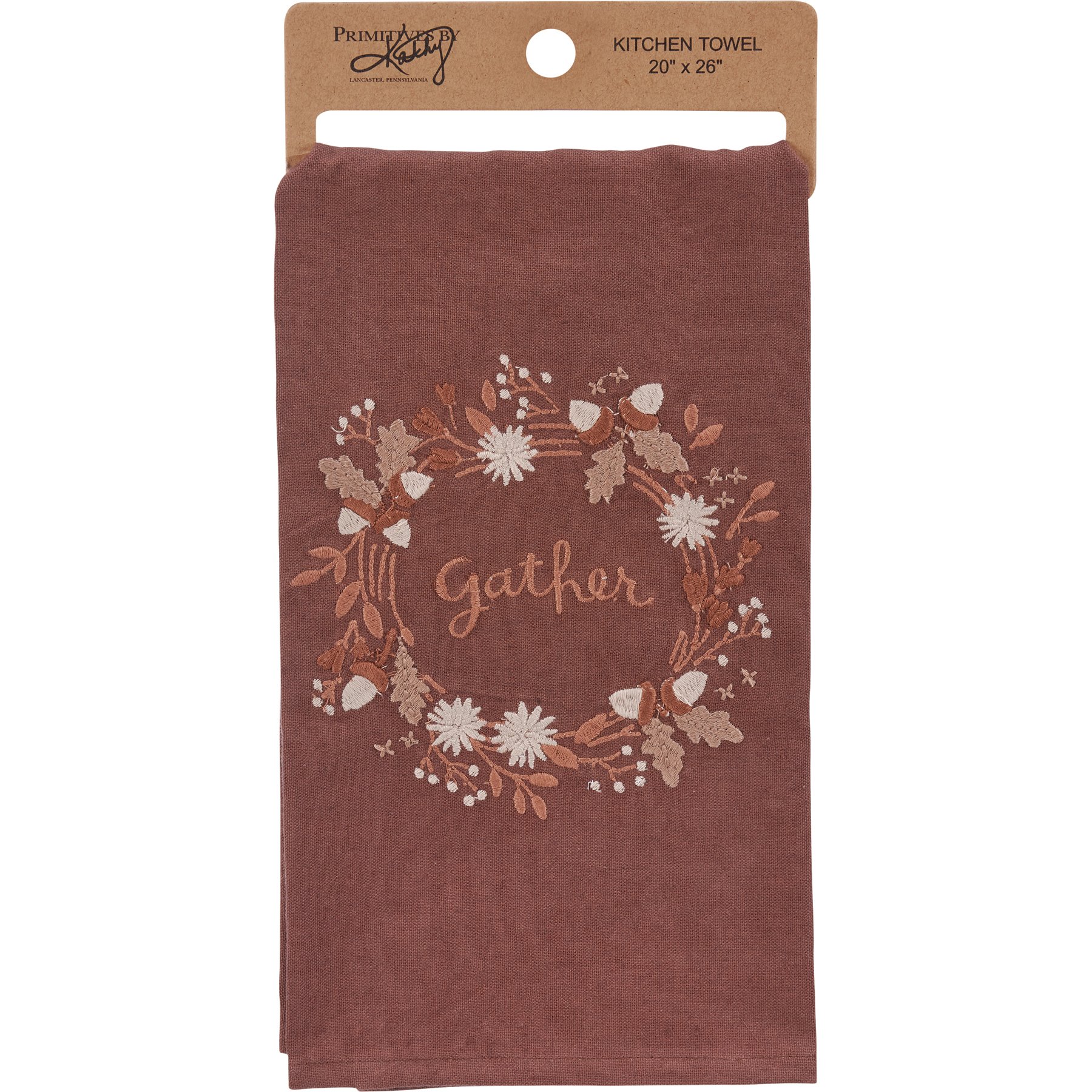 A brown cotton-linen blend kitchen towel from our Fall & Harvest Collection displaying a design of a fall foliage around a sentiment that reads "Gather." Design is embroidered for added detail. Our Gather kitchen towel is machine-washable for convenient cleaning. Packaged on a cardboard hanger with hole to easily display on rack. A charming and functional seasonal kitchen accent.