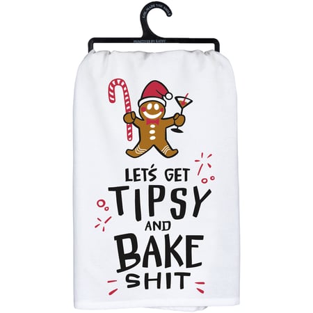 A white cotton kitchen towel from our Christmas Collection displaying a colorful hand illustrated design of a gingerbread man wearing a Santa hat holding a candy cane and cocktail with a fun Christmas baking-themed sentiment that reads "Let's Get Tipsy And Bake Shit." Our Get Tipsy And Bake kitchen towel is conveniently machine-washable for easy cleaning. Seasonal kitchen towel is packaged on a black plastic hanger to easily display on rack. A fun baking-themed Christmas gift perfect for a seasonal kitchen accessory.