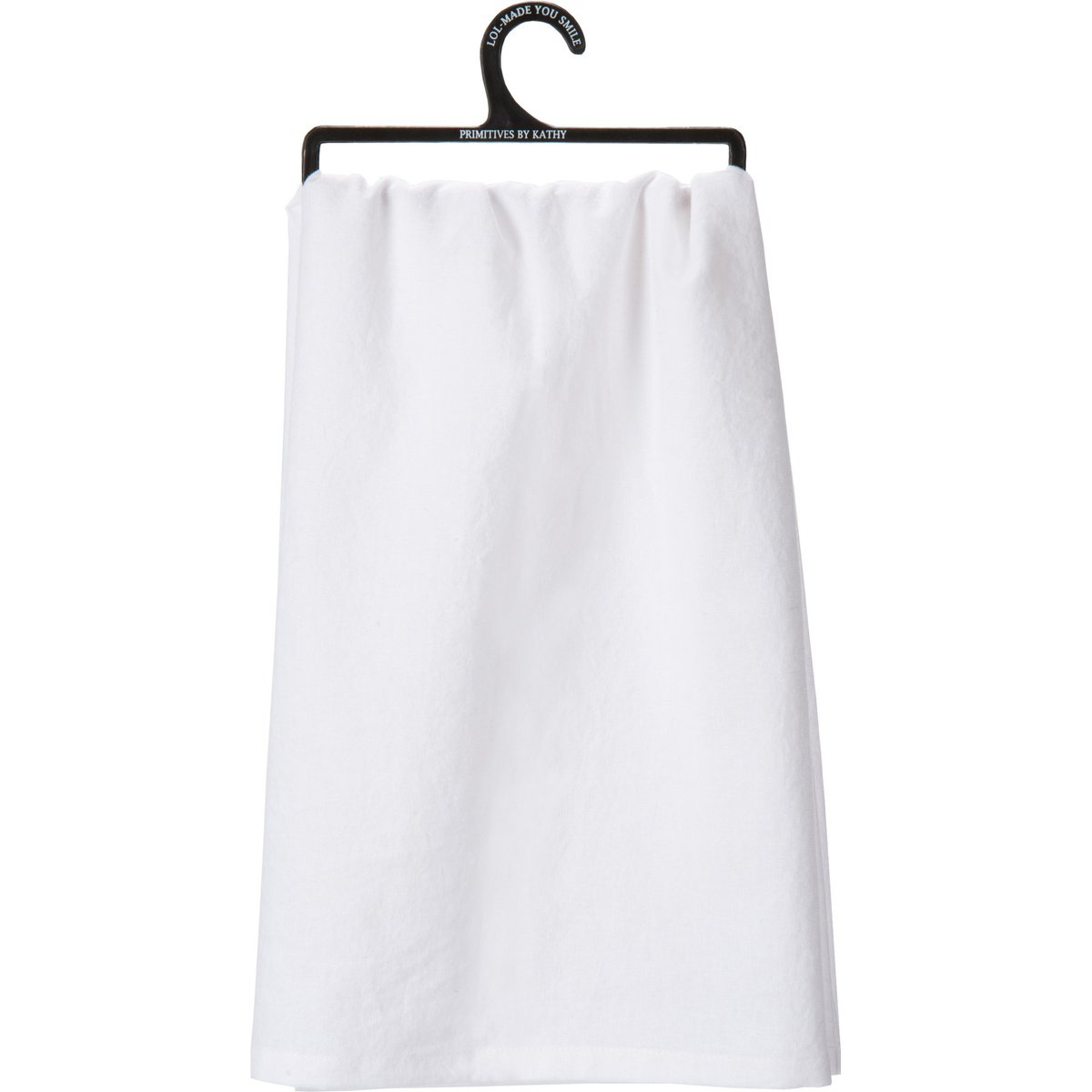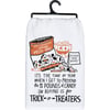 A black and white cotton kitchen towel from our Halloween Collection displaying a unique hand illustrated design of a large bag of Halloween candy and treat bowl. Design also includes orange accents and sentiment that reads "It's The Time Of Year When I Get To Pretend The 5 Pounds Of Candy I'm Buying Is For Trick-Or-Treaters." Our Get To Pretend The Candy kitchen towel is machine-washable for convenient cleaning. Packaged on a black plastic hanger to easily display on rack. A fun and functional seasonal kitchen accent.