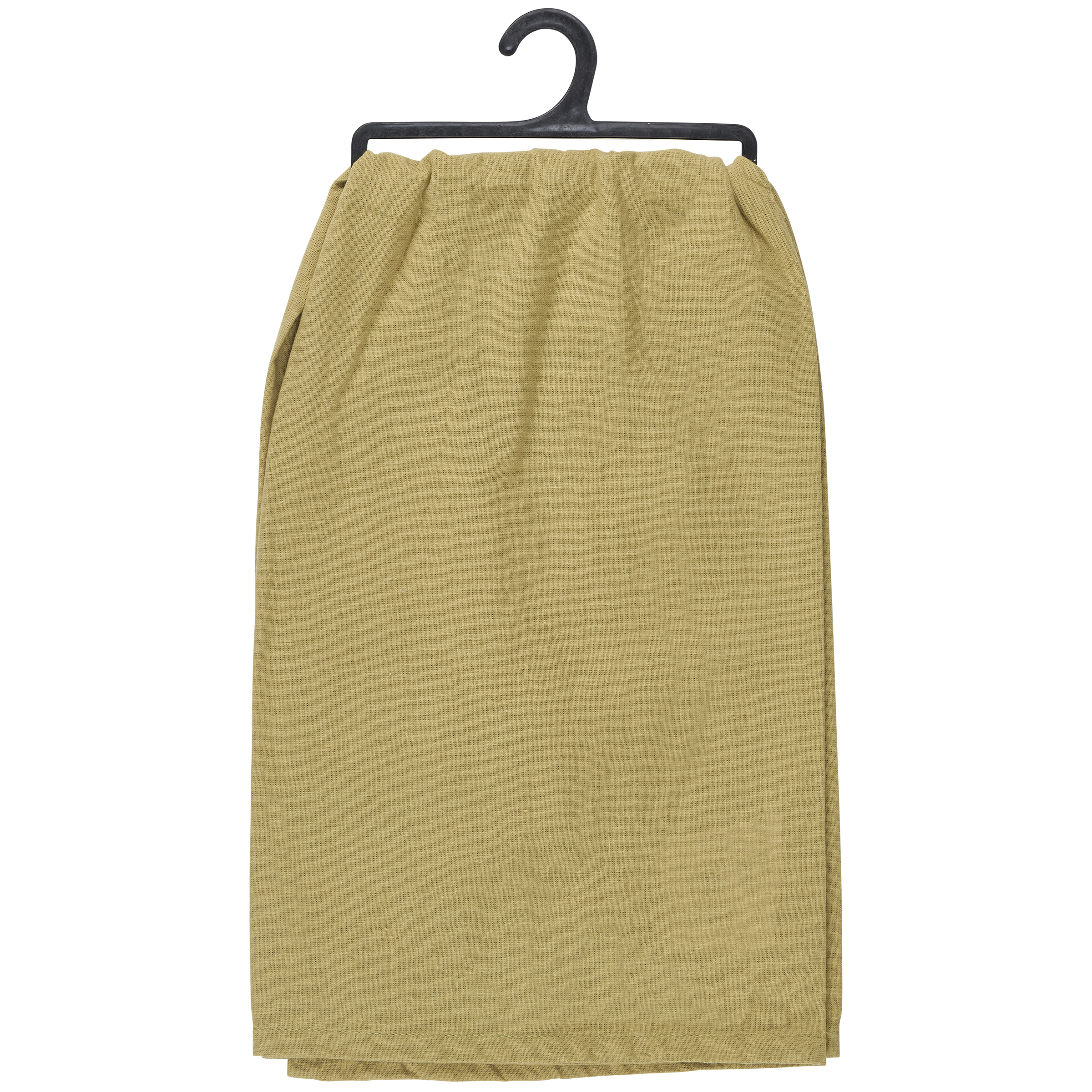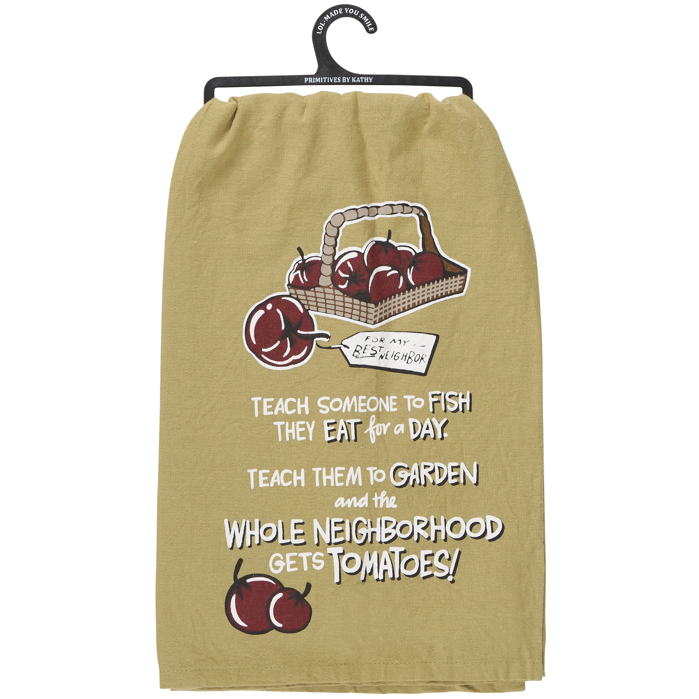 An olive green cotton kitchen towel from our Homestead Collection displaying a basket of tomatoes and a homestead inspired sentiment with unique hand illustrated details. Sentiment reads "Teach Someone To Fish - They Eat For A Day. Teach Them To Garden And The Whole Neighborhood Gets Tomatoes!" Our Gets Tomatoes kitchen towel is conveniently machine-washable for easy cleaning. Packaged on a black plastic hanger to easily display on rack. A fun homestead-themed kitchen accessory perfect for everyday use.