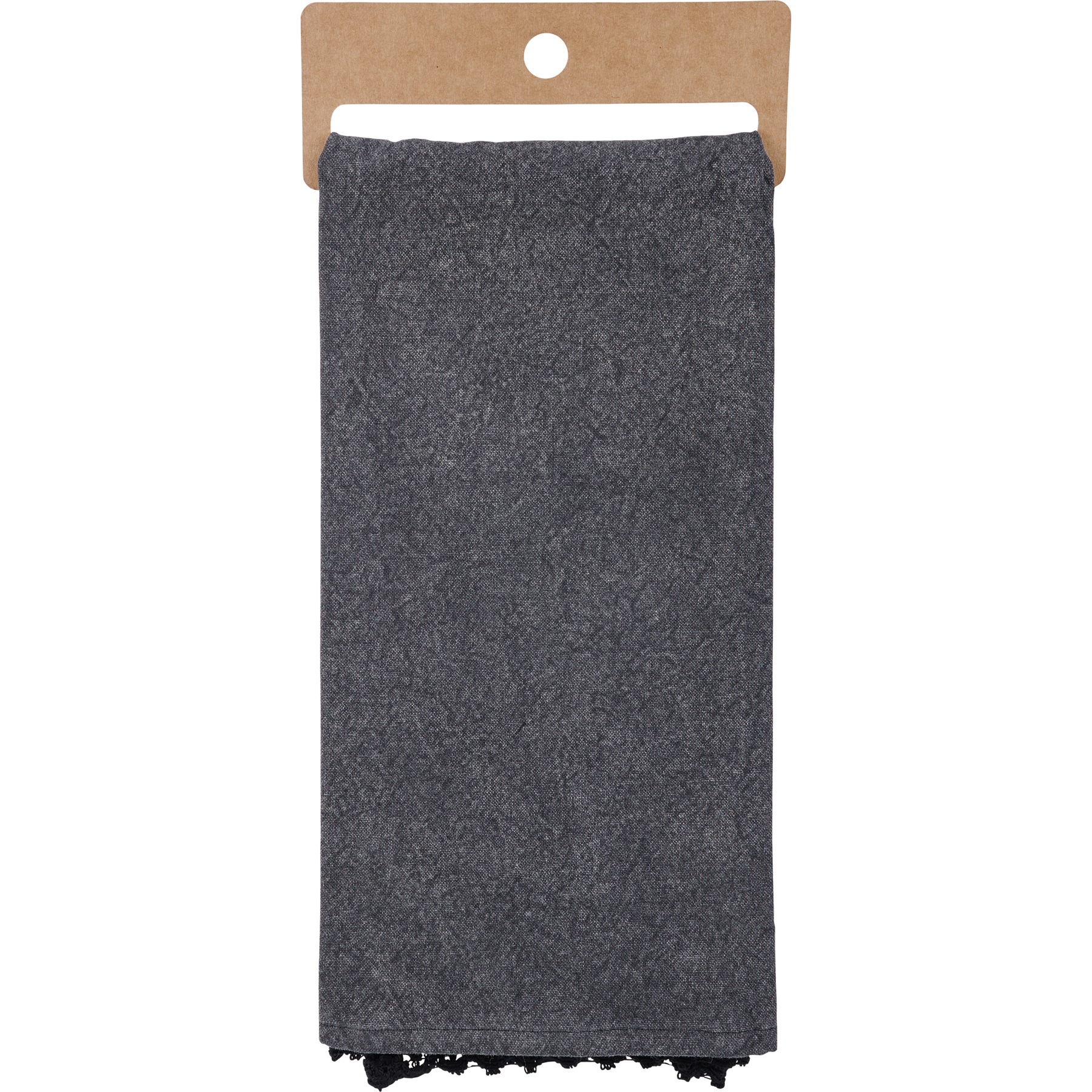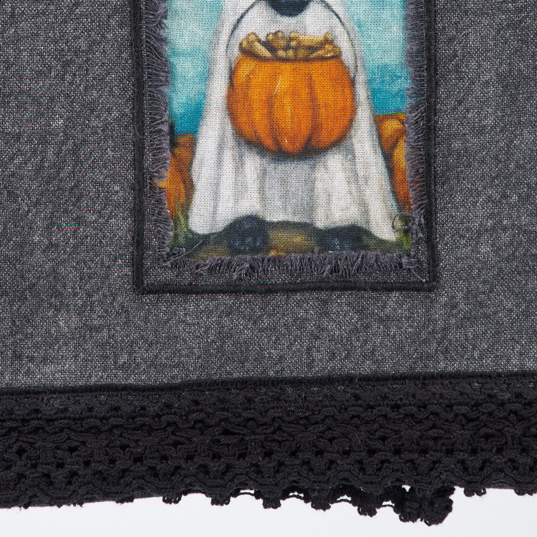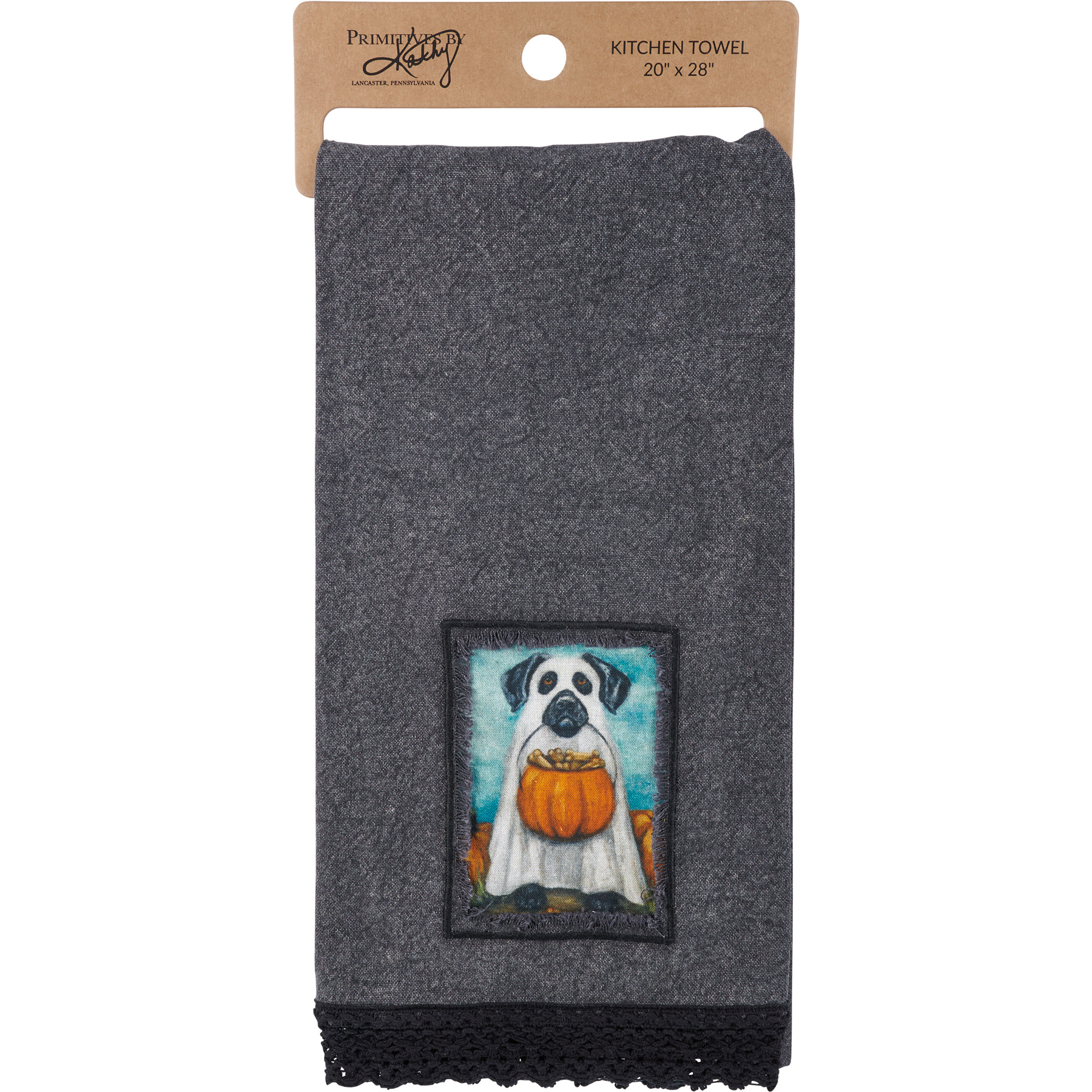 A cotton kitchen towel from our Halloween Collection featuring a stitched art panel with frayed edge on stonewashed black background and black lace trim. Design displays a dog in a ghost costume holding a pumpkin treat bucket replicated from original artwork painted onto burlap canvas, giving the art a unique depth and texture. Our Ghost Dog kitchen towel is machine-washable for convenient cleaning. Packaged on a cardboard hanger with hole to easily display on rack. A charming and functional seasonal kitchen accent.