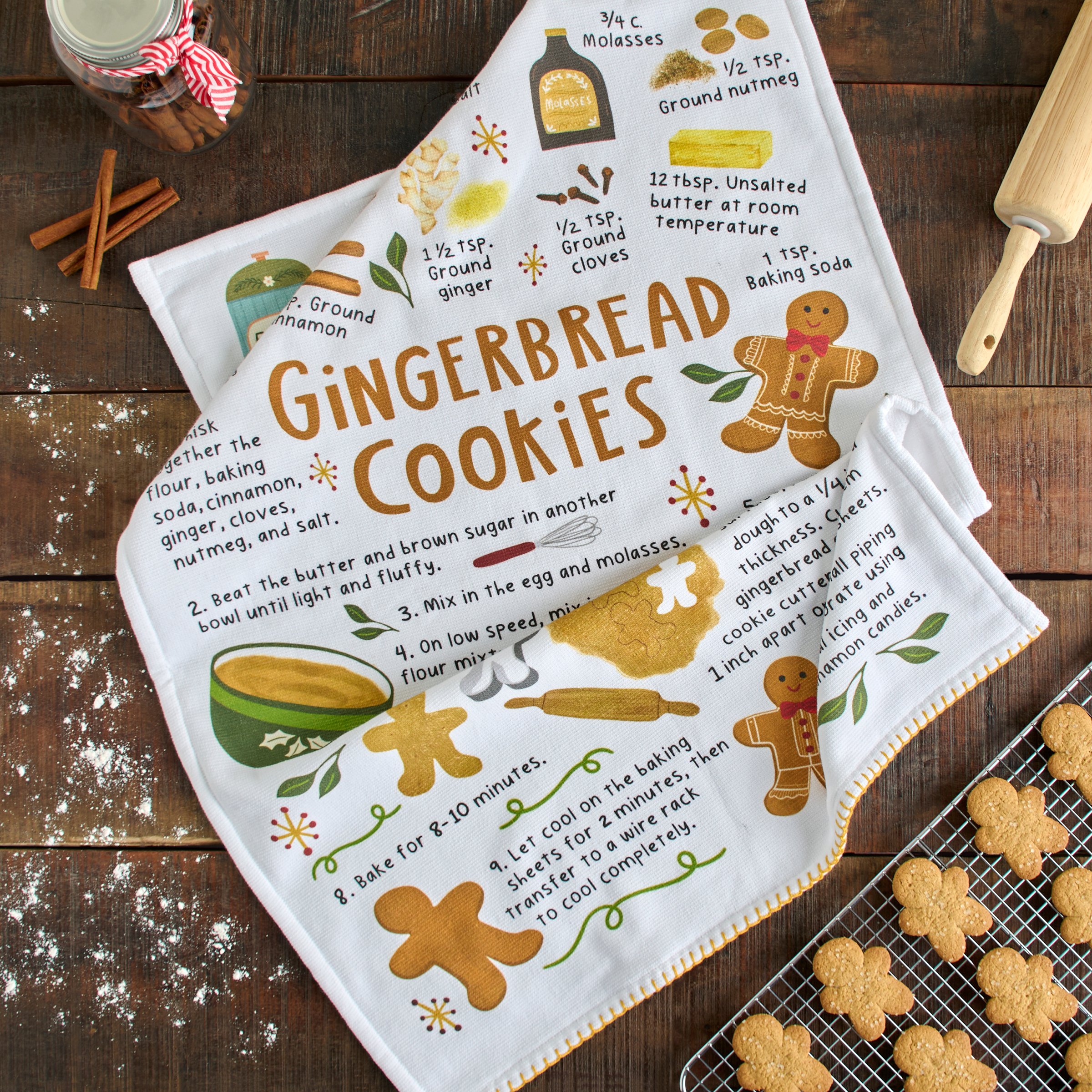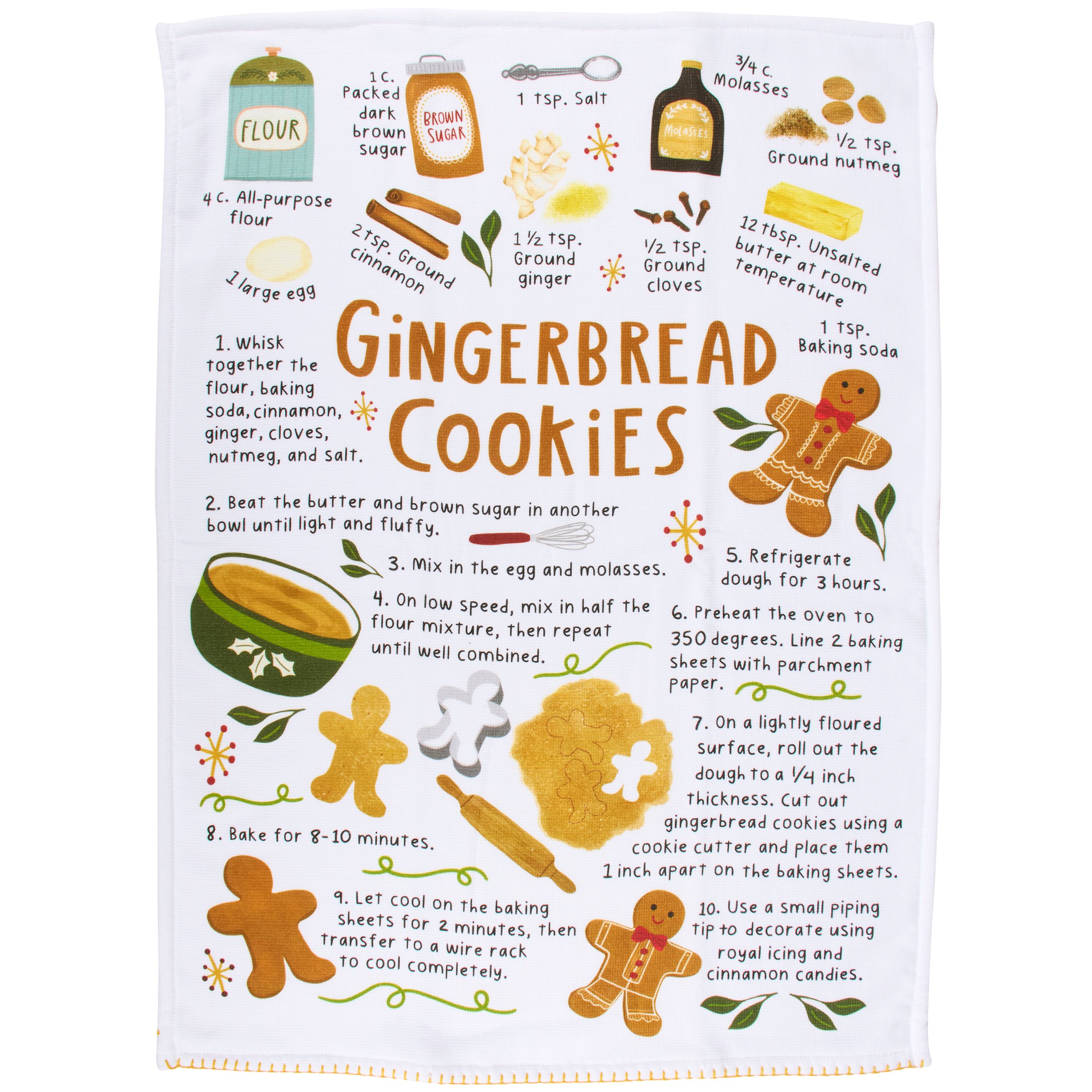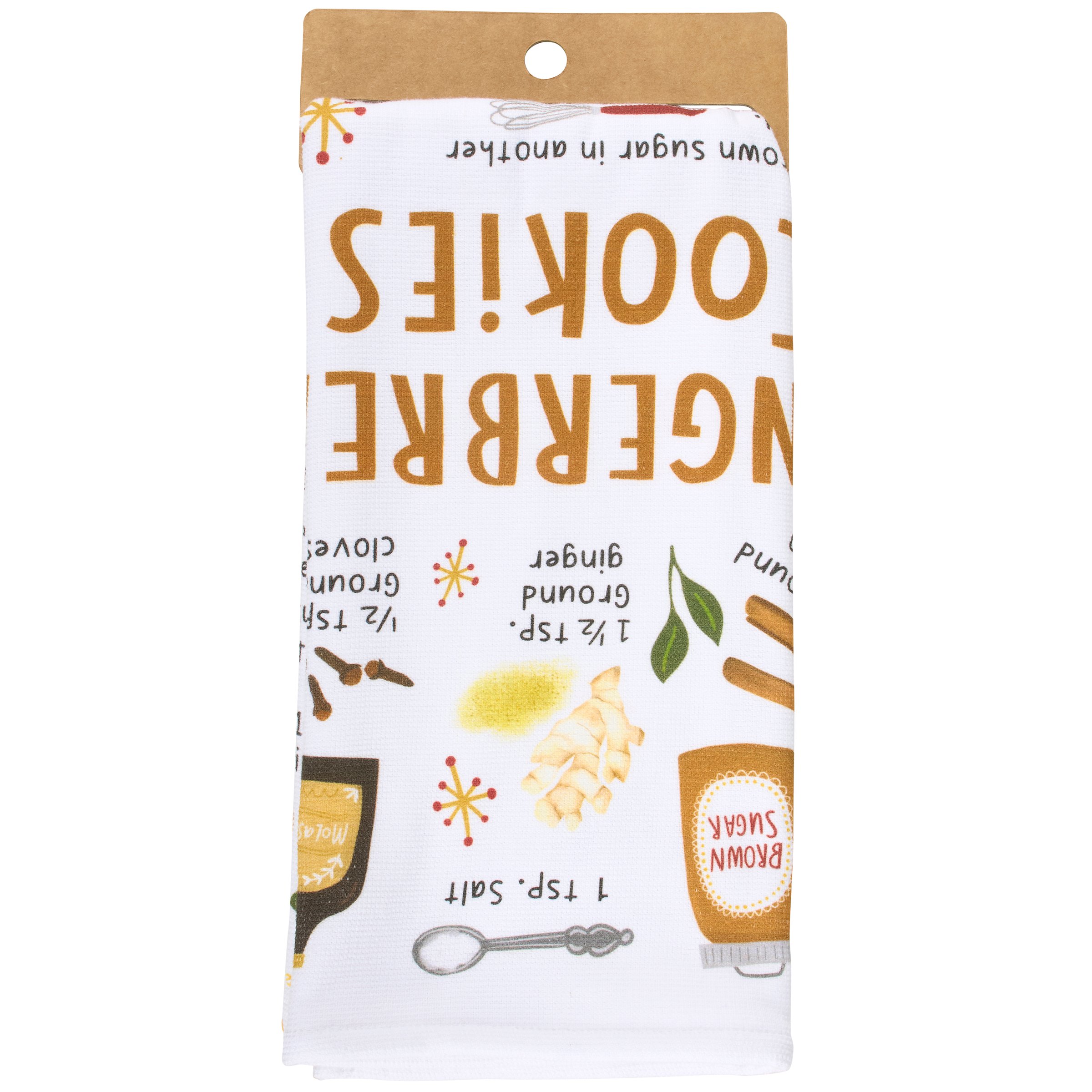 A cotton kitchen towel from our Christmas Collection featuring an all-over design displaying fun recipe inspired art replicated from original hand illustrated artwork. Homestead Christmas recipe design features instructions for making homemade gingerbread cookies with coordinating illustrations. Gingerbread cookies recipe is printed on textured slub fabric with a complementing orange hem stitch at the bottom. Christmas recipe kitchen towel features a terrycloth layer on the back for added absorbency and corner loop for hanging. Our Gingerbread Cookies Recipe kitchen towel is conveniently machine washable for easy cleaning. Seasonal kitchen towel is packaged on a cardboard hanger with hole to easily display on rack. A fun recipe themed Christmas gift perfect for a seasonal kitchen accessory.