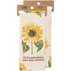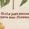 A cotton linen blend kitchen towel from our Garden Collection featuring all-over vintage style sunflower designs and punny embroidered "Girls Just Wanna Have Sun-flowers" sentiment. Features a cotton tape loop in the corner for easy hanging. Our Girls Just Wanna Have Sun-flowers kitchen towel is machine-washable. Towel is packaged on a cardboard hanger with a hole to easily hang on rack.