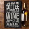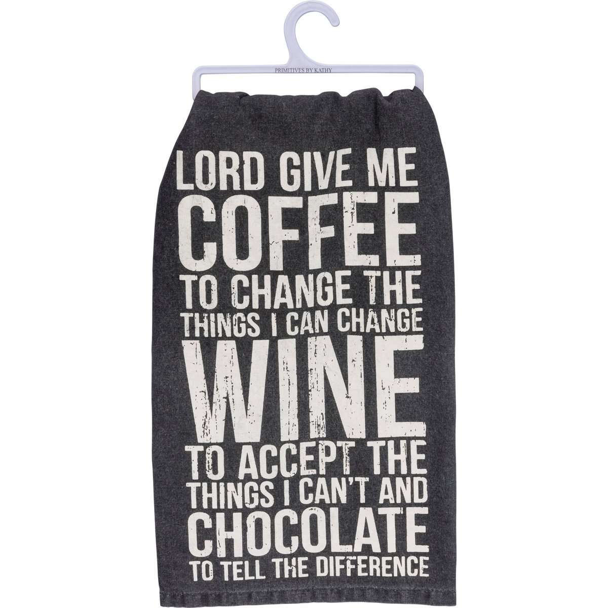 A classic black and white cotton kitchen towel featuring a distressed "Lord Give Me Coffee To Change The Things I Can Change - Wine To Accept The Things I Can't And Chocolate To Tell The Difference!" sentiment. Machine-washable.
