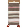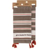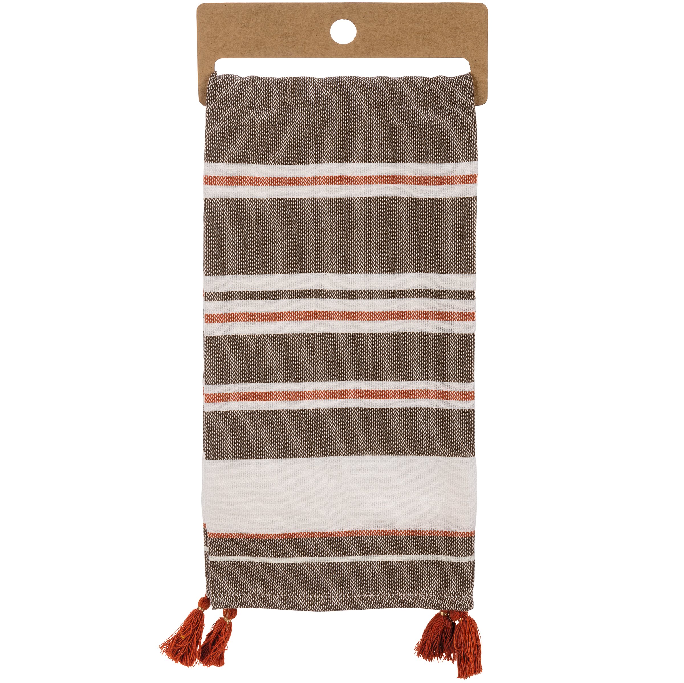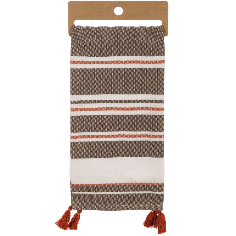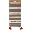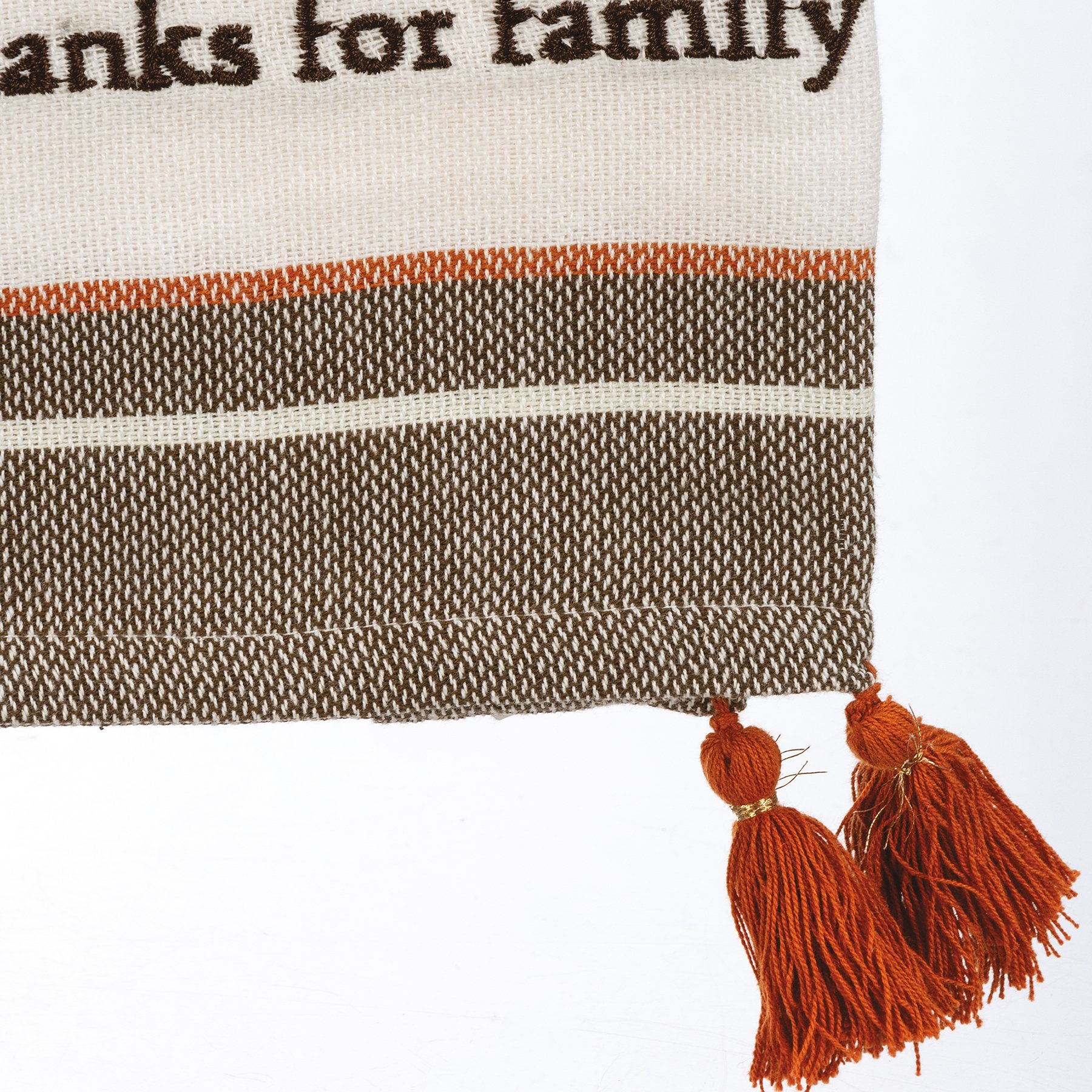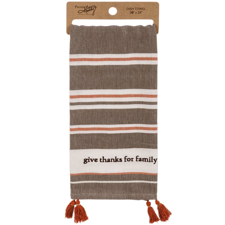A cotton kitchen towel from our Fall & Harvest Collection features a fall-inspired color palette with embroidered "Give Thanks For Family" sentiment and woven stripe designs. Includes tassel accents for added interest. Towel is packaged on a cardboard hanger to easily display on rack. Our Give Thanks For Family kitchen towel is machine-washable.