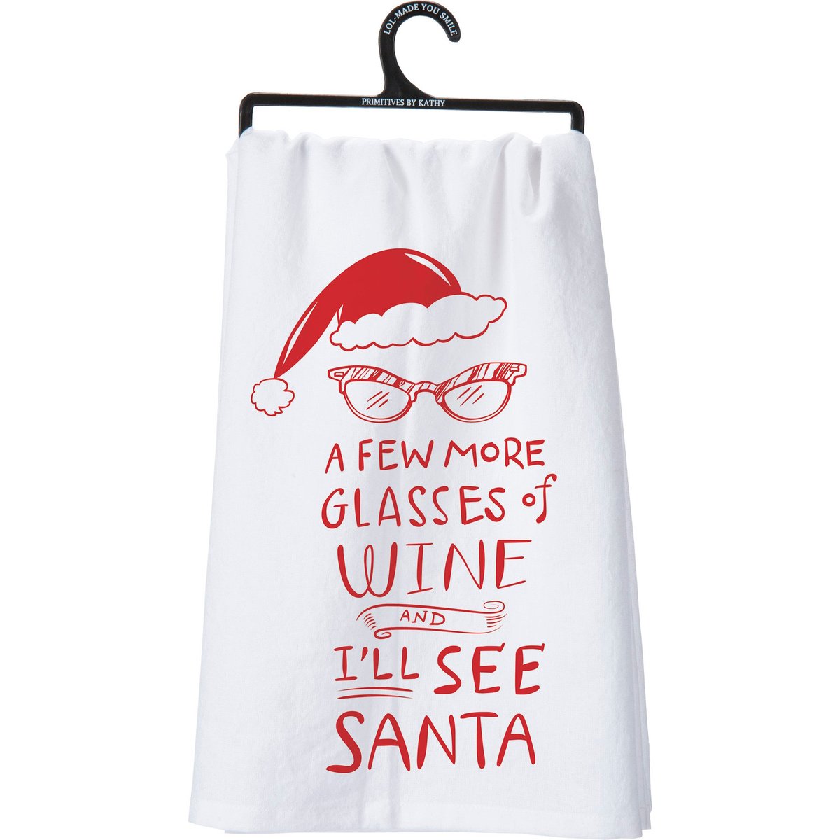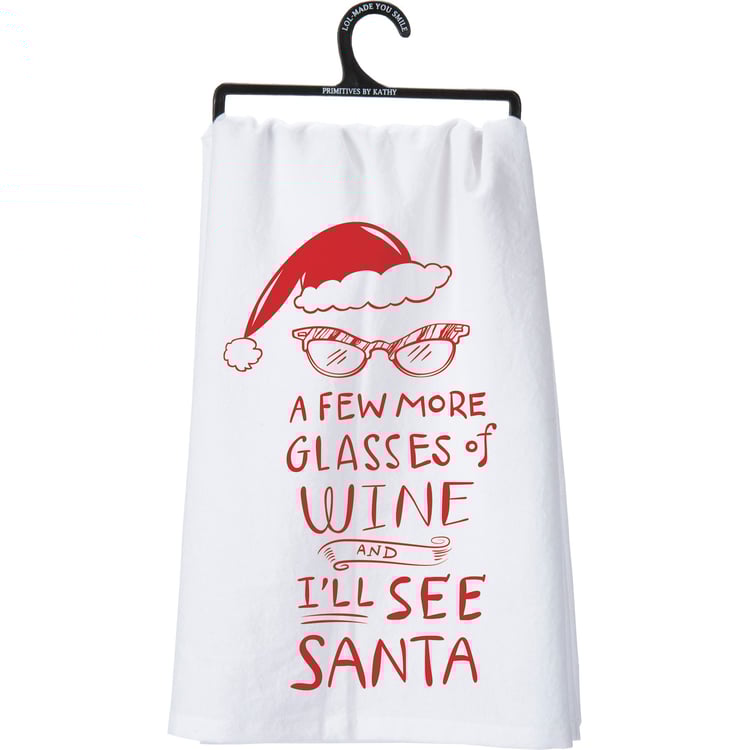 A red and white cotton kitchen towel lending a hand lettered "A Few More Glasses Of Wine And I'll See Santa" sentiment with glasses and Santa hat designs. Complements well with existing kitchen décor. Machine-washable.