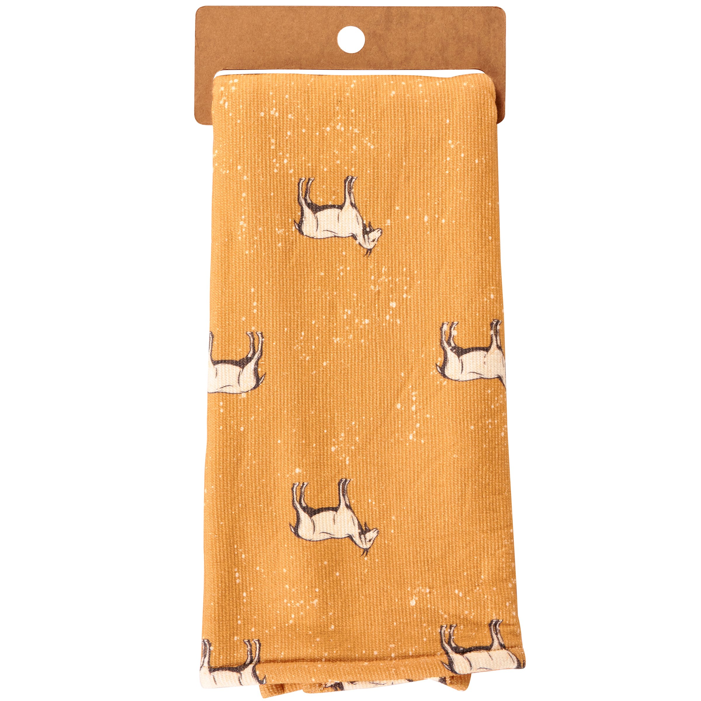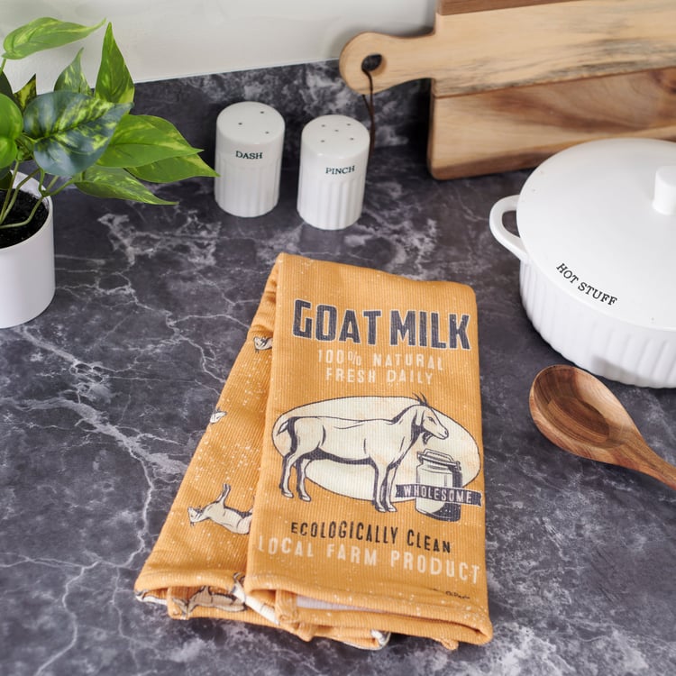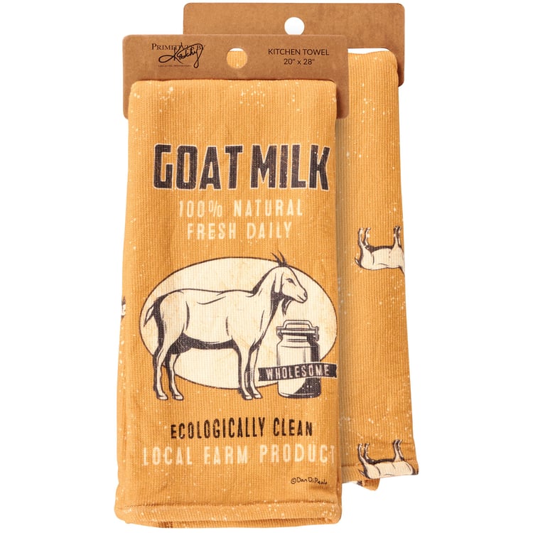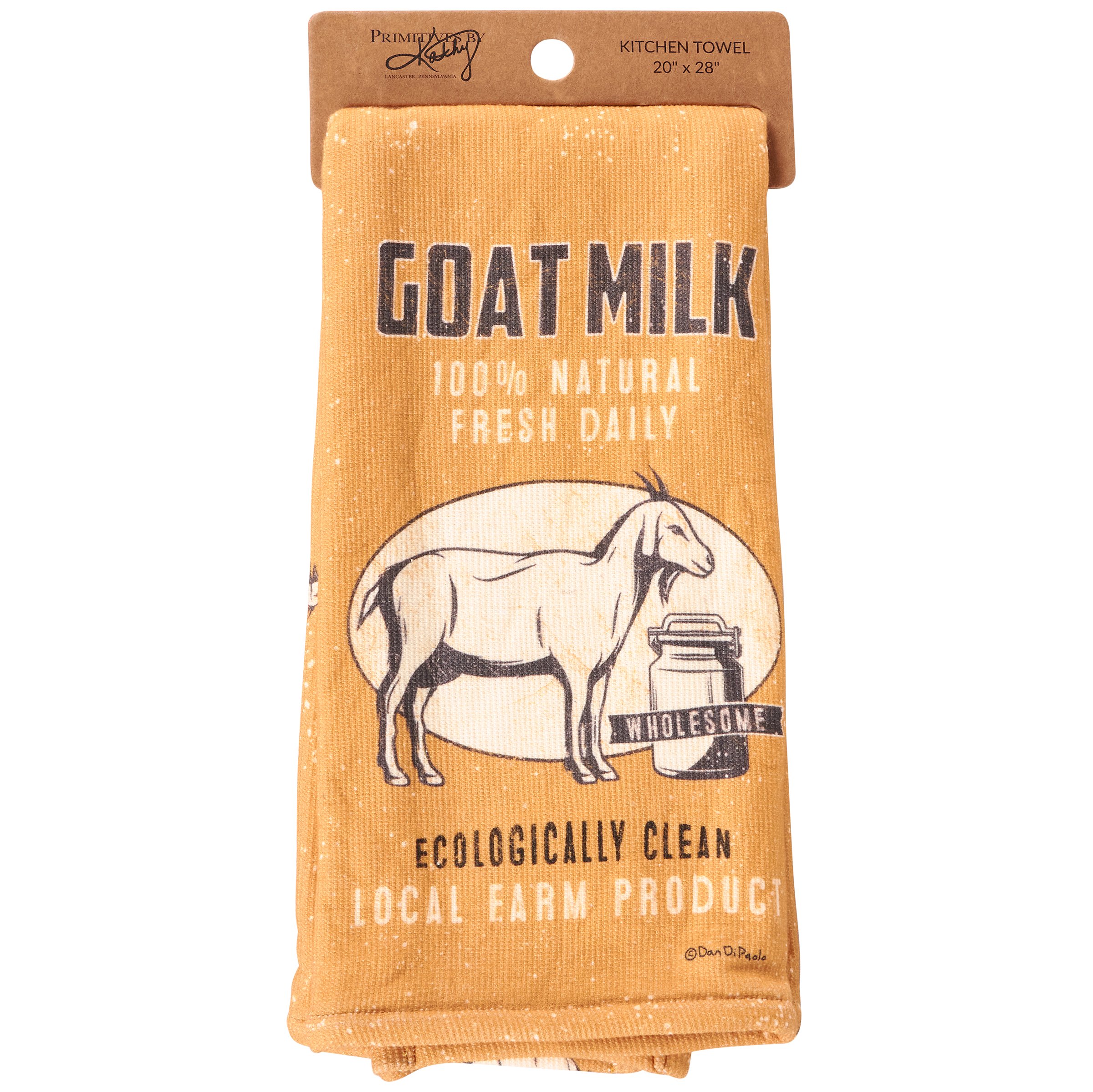A cotton kitchen towel from our Homestead Collection displaying a rustic local farm inspired design of a goat and milk canister with a sentiment that reads "Goat Milk 100% Natural Fresh Daily - Ecologically Clean - Local Farm Product." Farm kitchen towel also features an all-over design of goats and terrycloth layer on the back for added absorbency. Our Goat Milk kitchen towel is conveniently machine-washable for easy cleaning. Rustic towel is packaged on a cardboard hanger with hole to easily display on rack. A rustic farm-themed kitchen accessory perfect for everyday use.