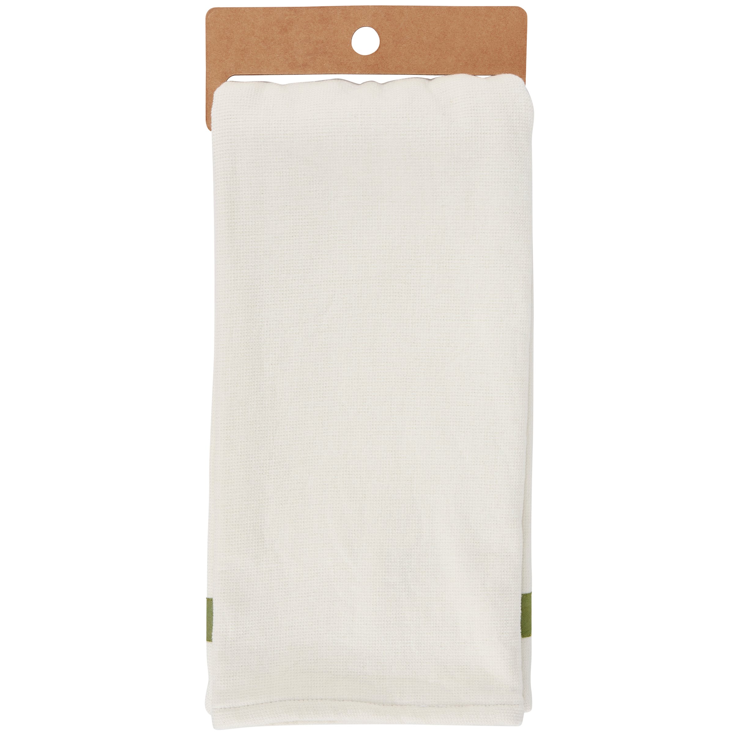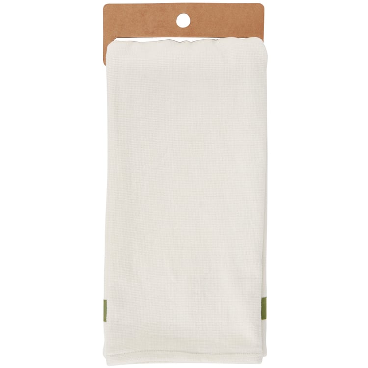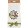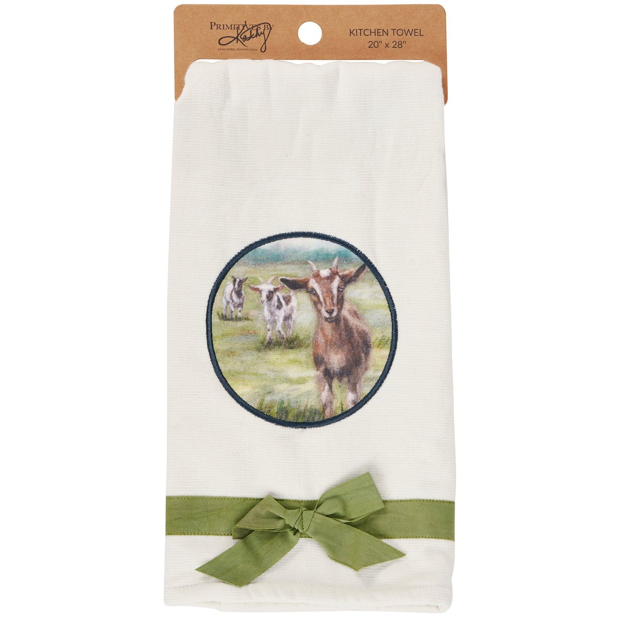 A cotton kitchen towel from our Farmhouse Collection featuring a farm animal inspired design with a stitched art panel and green ribbon accent. Art panel displays a charming scene of farm goats in a field replicated from original artwork painted onto burlap canvas, giving the art a unique depth and texture. Goat kitchen towel features a terrycloth layer on the back for added absorbency. Our Goats kitchen towel is conveniently machine-washable for easy cleaning. Farm kitchen towel is packaged on a cardboard hanger with hole to easily display on rack. A rustic farm-themed kitchen accessory perfect for everyday use.