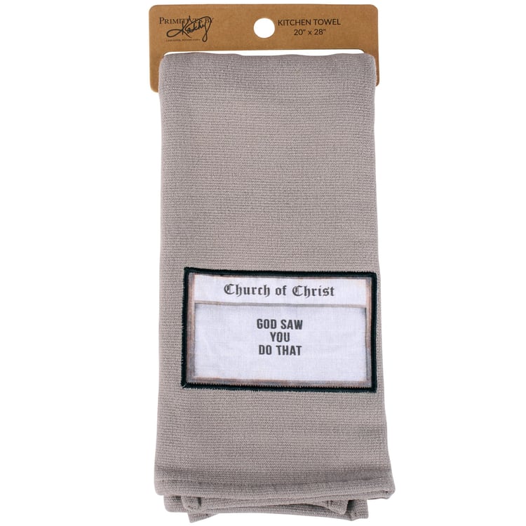 A gray cotton kitchen towel from our Faith Collection featuring a stitched art panel displaying a church sign inspired design with a funny faith sentiment that reads "God Saw You Do That." Church sign kitchen towel also features a terrycloth layer on the back for added absorbency. Our God Saw You Do That kitchen towel is conveniently machine-washable for easy cleaning. Funny faith towel is packaged on a cardboard hanger with hole to easily display on rack. A fun faith-themed kitchen accessory perfect for everyday use.
