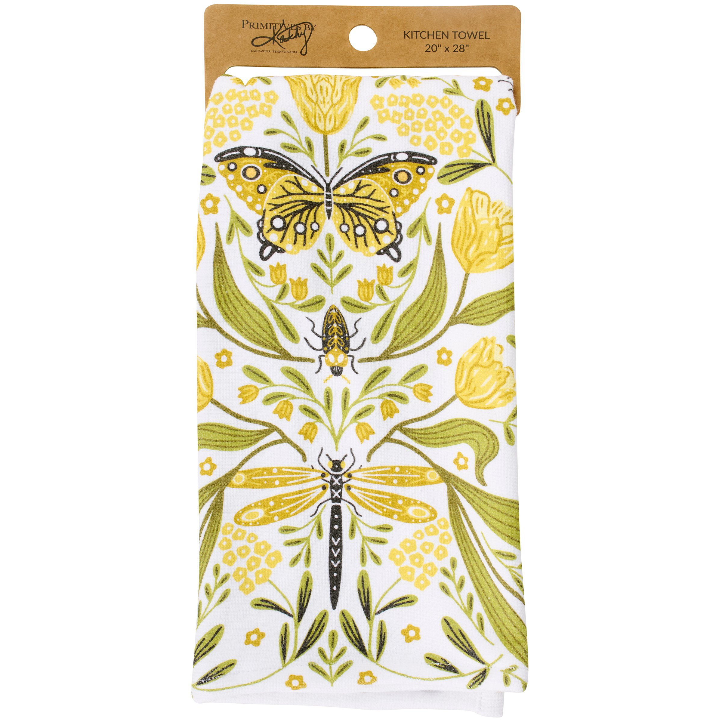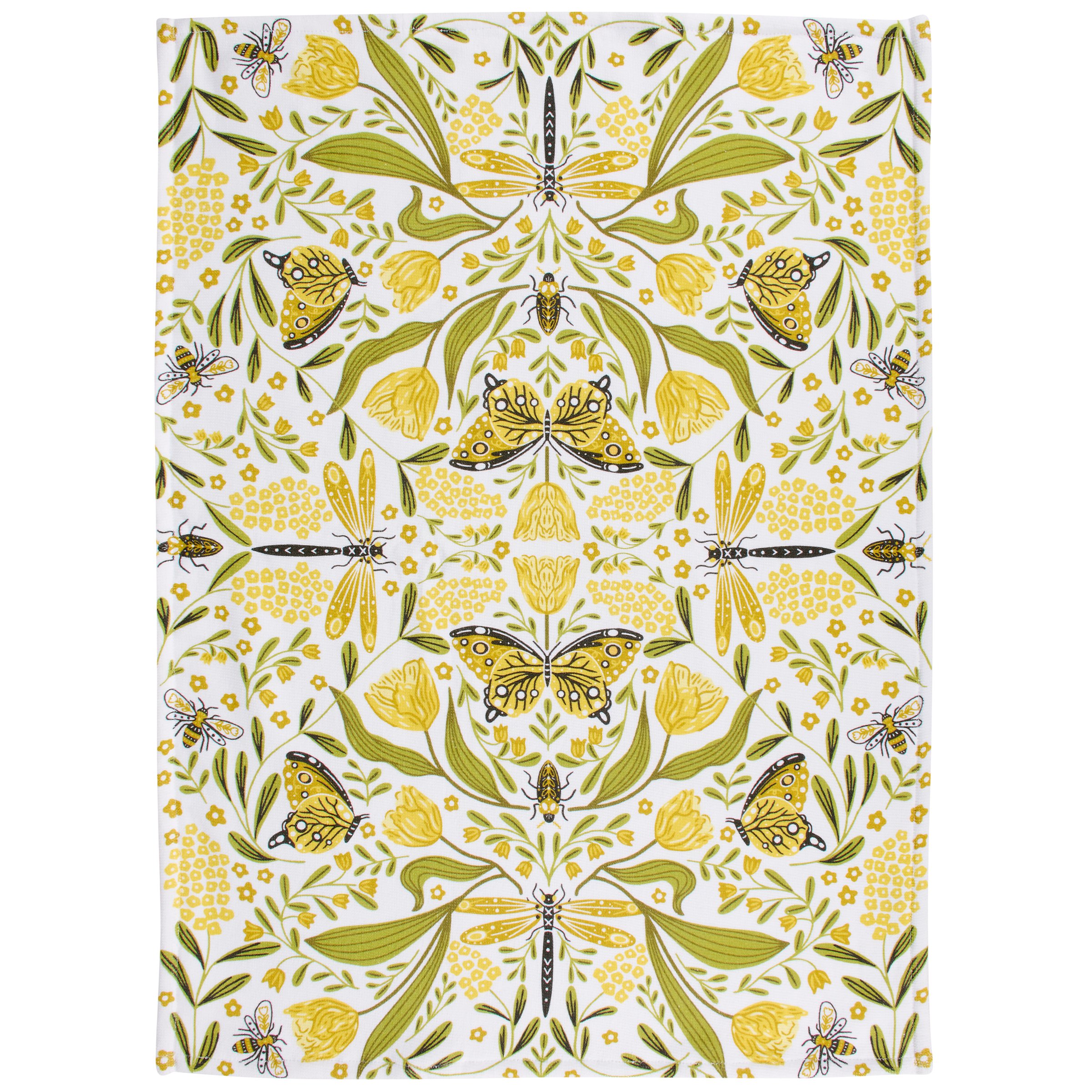 A cotton kitchen towel from our Botanical Collection displaying an all-over design of golden flowers and garden insects including a dragonfly replicated from original hand illustrated artwork inspired by folk art. Dragonfly kitchen towel features a terrycloth layer on the back for added absorbency. Our Golden Dragonfly kitchen towel is conveniently machine-washable for easy cleaning. Botanical towel is packaged on a cardboard hanger with hole to easily display on rack. A floral themed kitchen accessory perfect for everyday use.