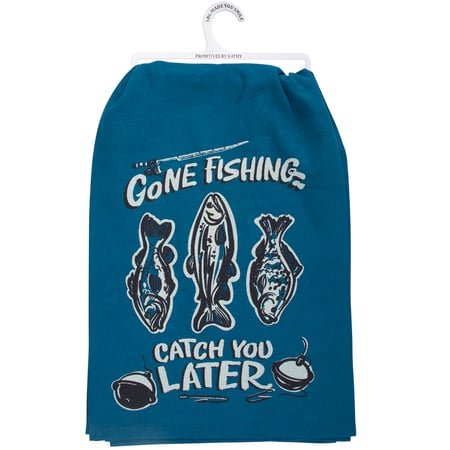 A blue cotton kitchen towel from our Lake & Cabin Collection displaying a playful hand illustrated design of fish and fishing rod with a fun fishing inspired sentiment that reads "Gone Fishing - Catch You Later." Our Gone Fishing kitchen towel is conveniently machine-washable for easy cleaning. This fishing kitchen towel is packaged on a white plastic hanger to easily display on rack. A fun fishing themed gift perfect for adding personality to any kitchen while showing off a love for the outdoors.