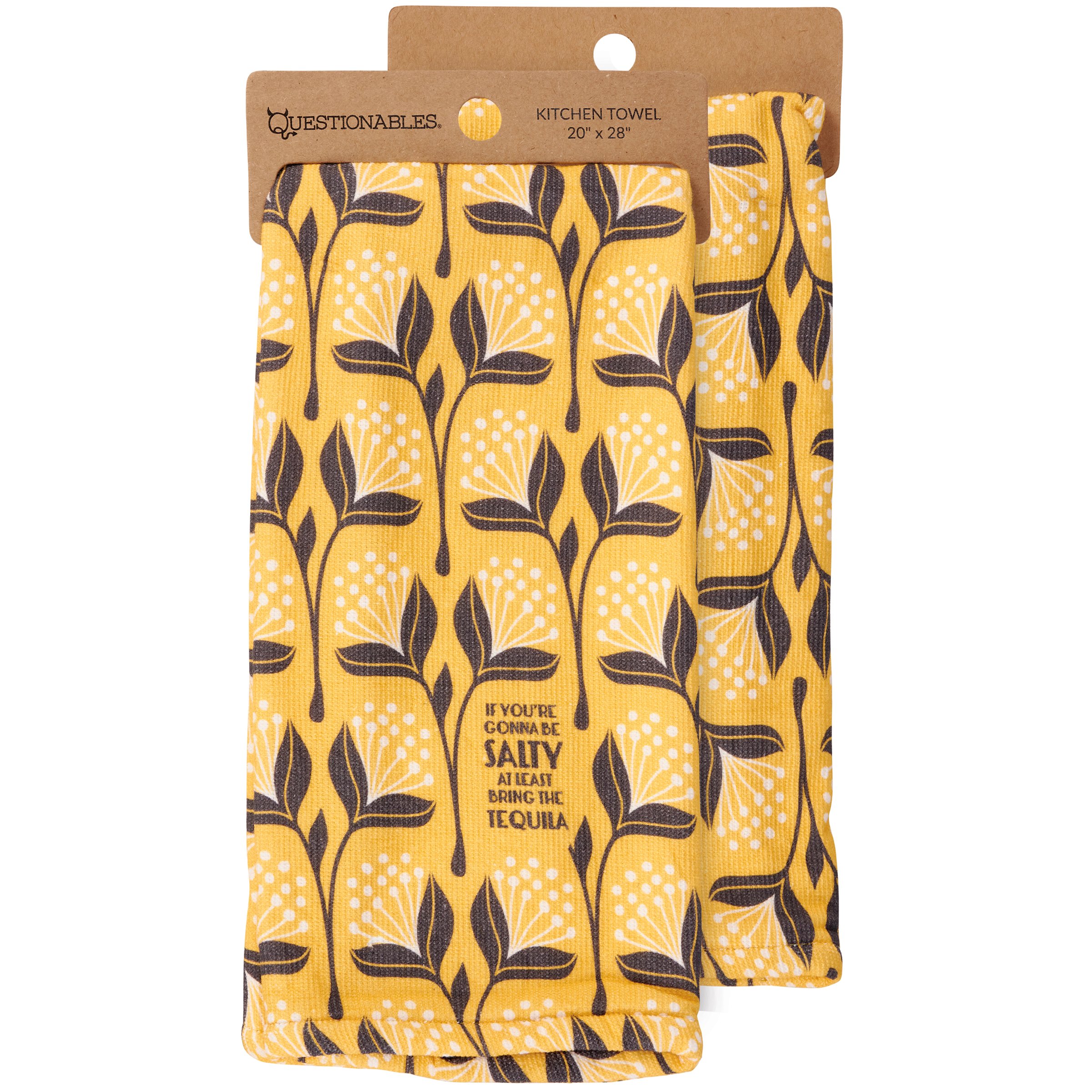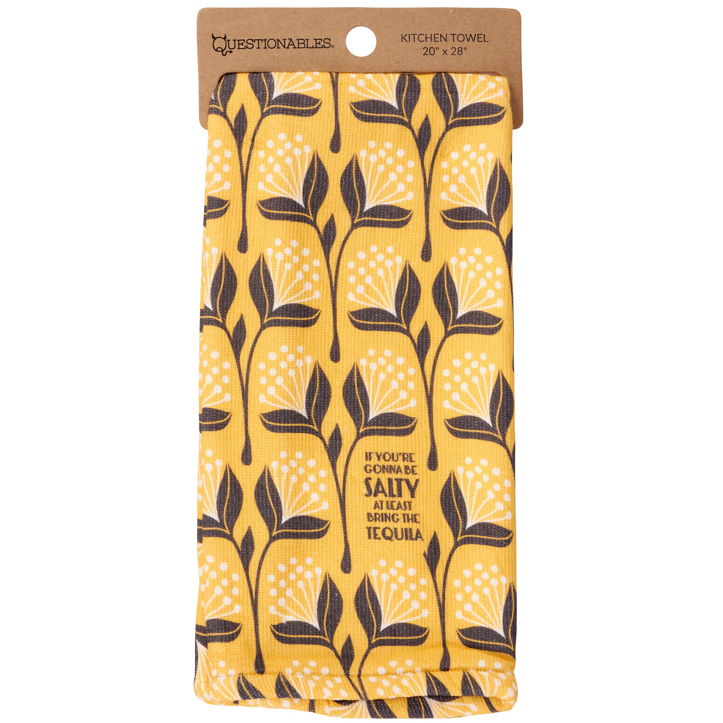 Anyone else done with keeping every little thought to themselves? I mean, why be tongue-in-cheek when it's more fun to stick it out for the world to see? This super-soft cotton kitchen towel flaunts a stylish floral pattern with a sassy sentiment that reads "If You're Gonna Be Salty At Least Bring The Tequilla." Fold to display the flower pattern for the timid guests or flip to display the relatable sentiment for the more hardcore friends. Questionables kitchen towel features an absorbent terrycloth layer on the back to soak up whatever you throw at it. Machine-washable for stress-free cleaning. Packaged on a cardboard hanger with a hole to beautifully display on rack. Our Gonna Be Salty kitchen towel demands attention and tells people to put that attitude to good use.