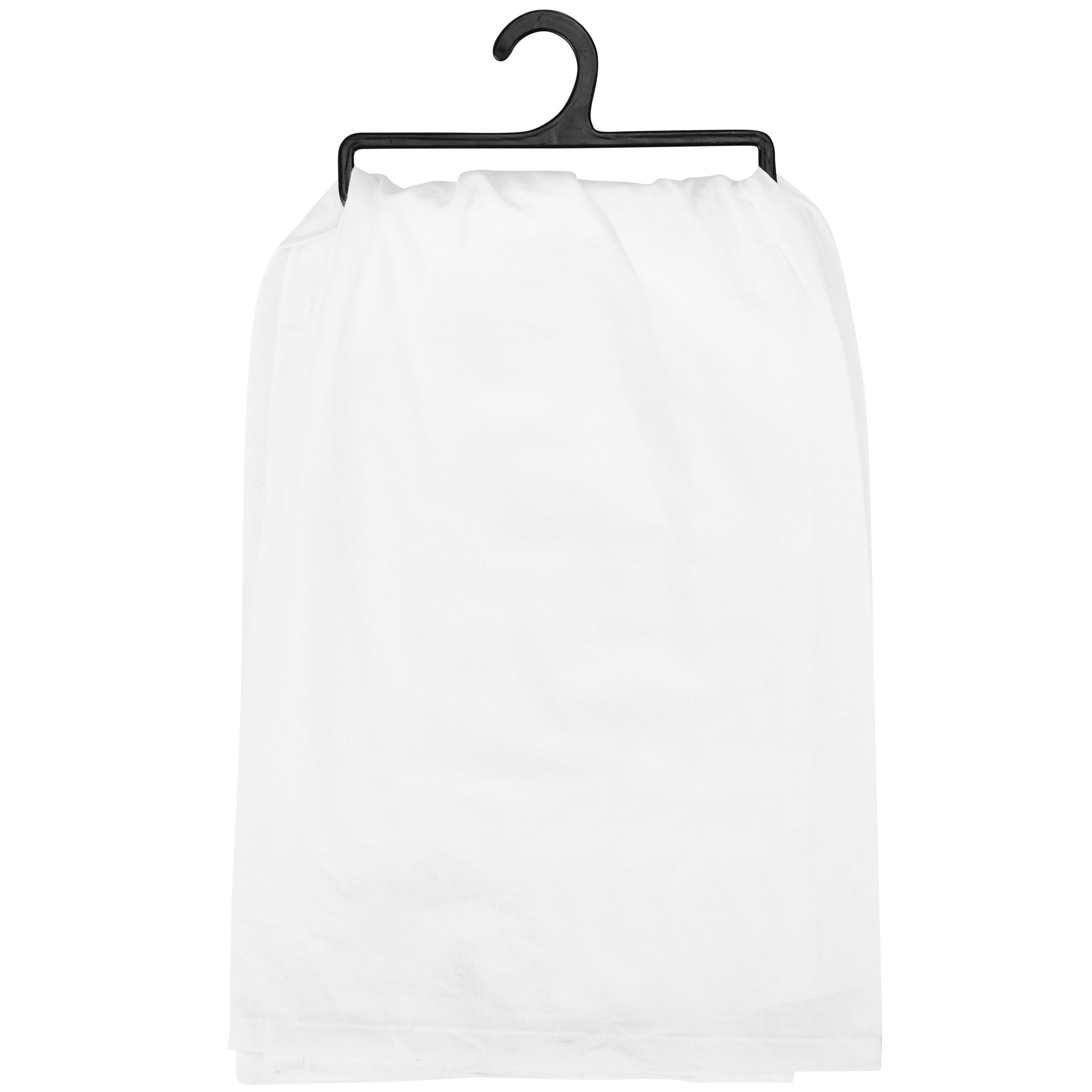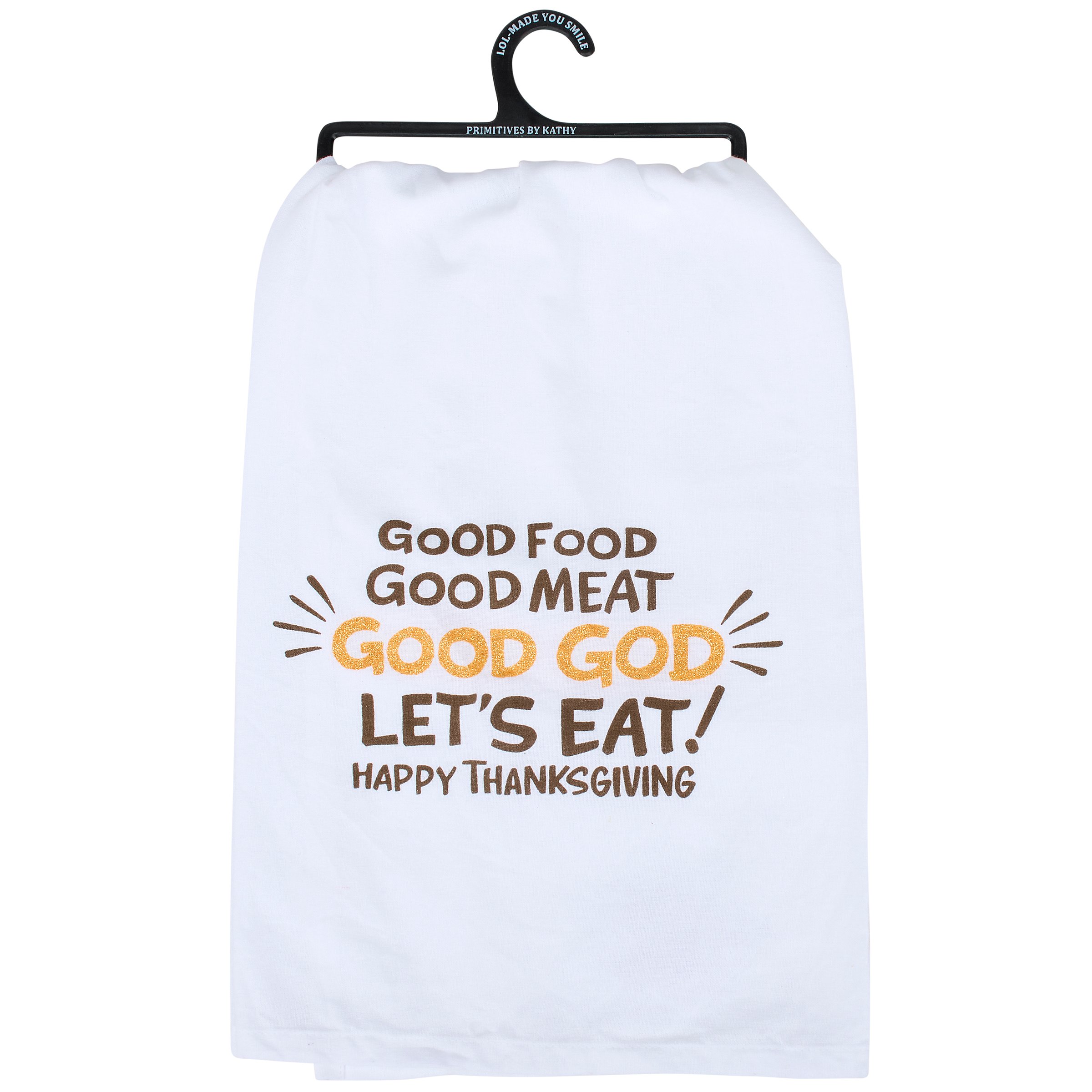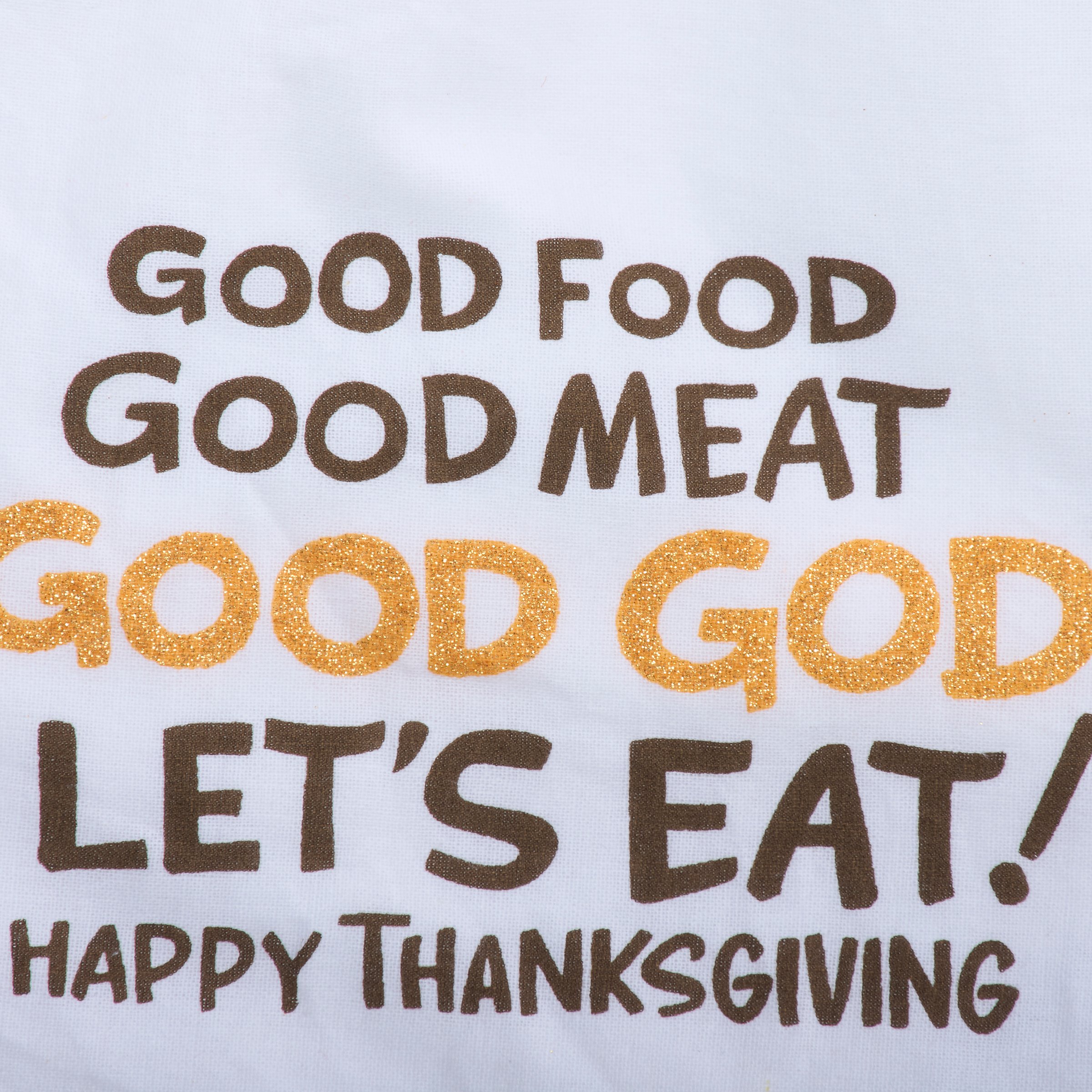 A white cotton kitchen towel from our Fall & Harvest Collection displaying a fun Thanksgiving sentiment in a playful hand illustrated style that reads "Good Food Good Meat Good God Let's Eat! Happy Thanksgiving." Funny Thanksgiving design features glitter details for added interest. Our Good Thanksgiving Food kitchen towel is conveniently machine-washable for easy cleaning and glitter will not transfer. This seasonal kitchen towel is packaged on a black plastic hanger to easily display on rack. A fun Thanksgiving kitchen accessory perfect for adding personality to any kitchen while holiday decorating.