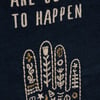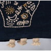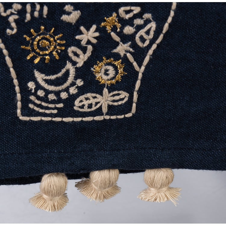A navy blue cotton kitchen towel featuring embroidered "Good Things Are Going To Happen" sentiment and mystical hand design. Includes tassel accents for added interest. Machine-washable.