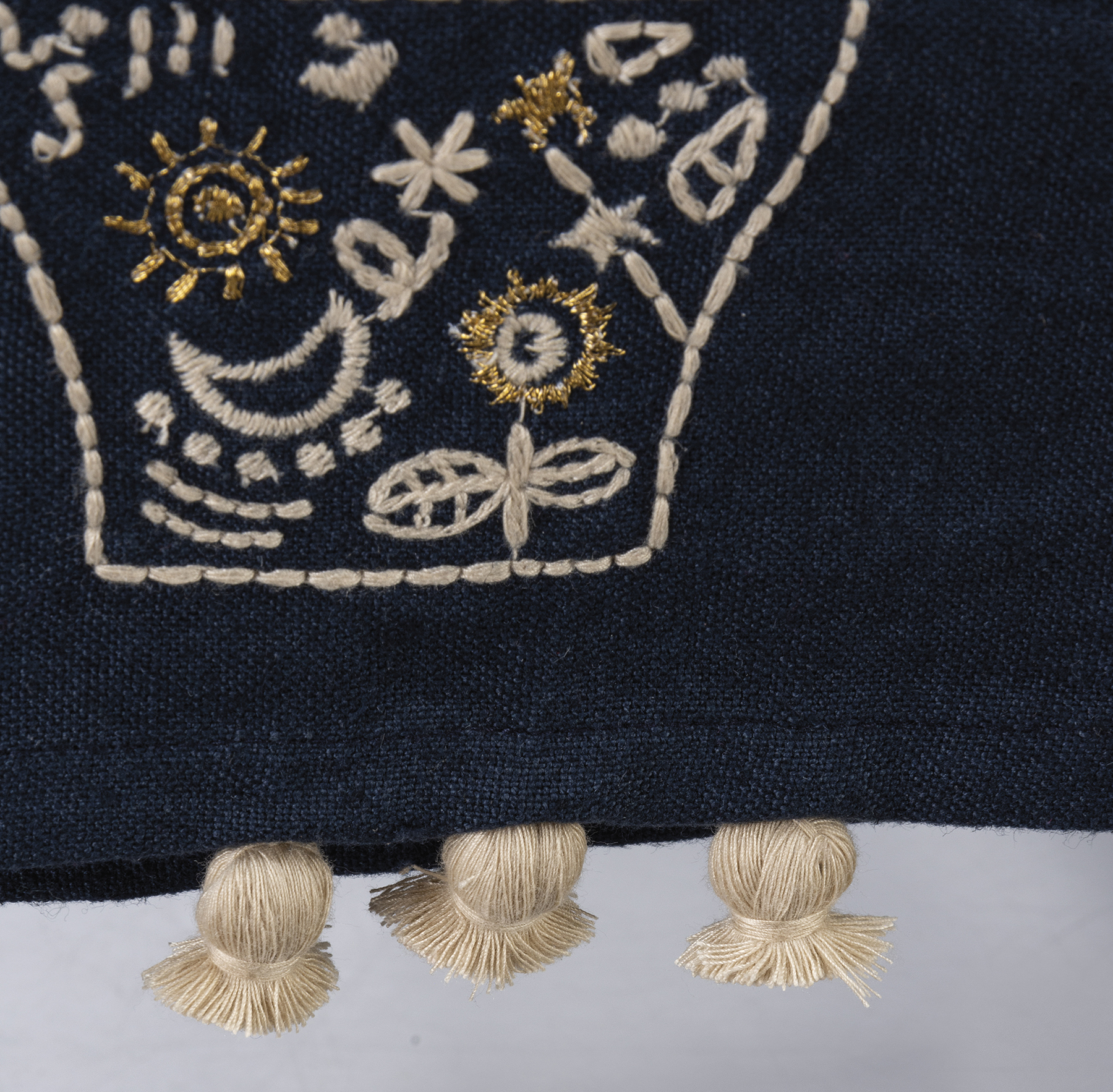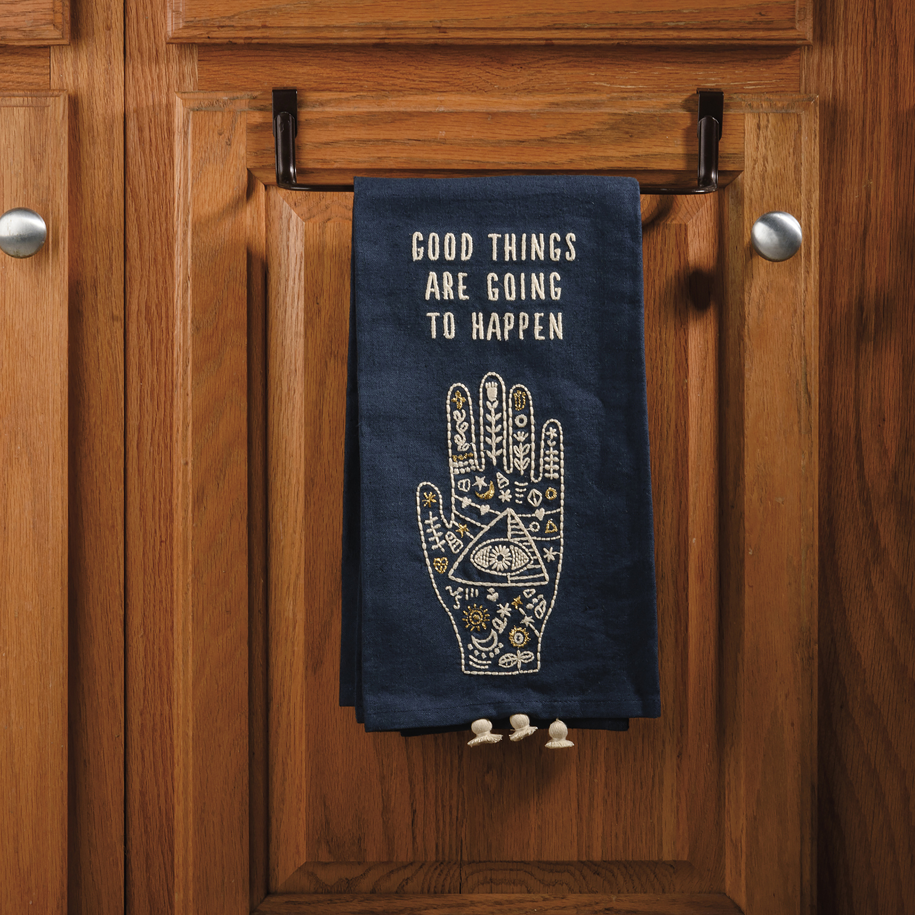 A navy blue cotton kitchen towel featuring embroidered "Good Things Are Going To Happen" sentiment and mystical hand design. Includes tassel accents for added interest. Machine-washable.