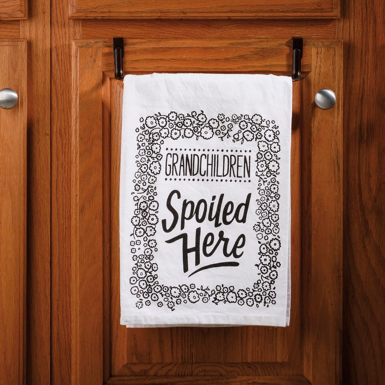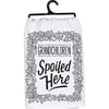 A black and white cotton kitchen towel featuring "Grandchildren Spoiled Here" sentiment and floral design. Machine-washable.