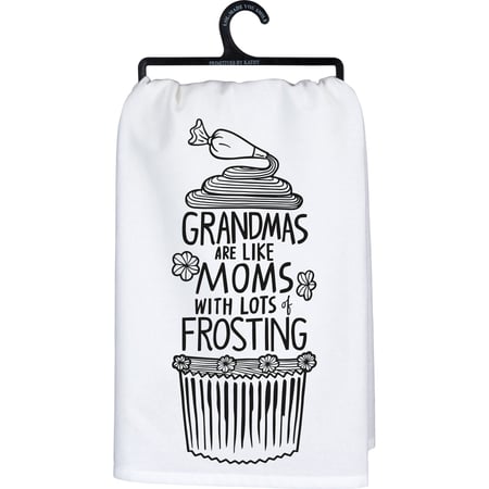 A black and white cotton kitchen towel from our LOL Made You Smile Collection displaying a hand illustrated design of a cupcake and piping bag spreading icing with heart-warming sentiment that reads "Grandmas Are Like Moms With Lots Of Frosting." Our Grandmas With Frosting kitchen towel is machine-washable for convenient cleaning. Packaged on a black plastic hanger to easily display on rack. A fun and functional everyday kitchen accent.