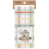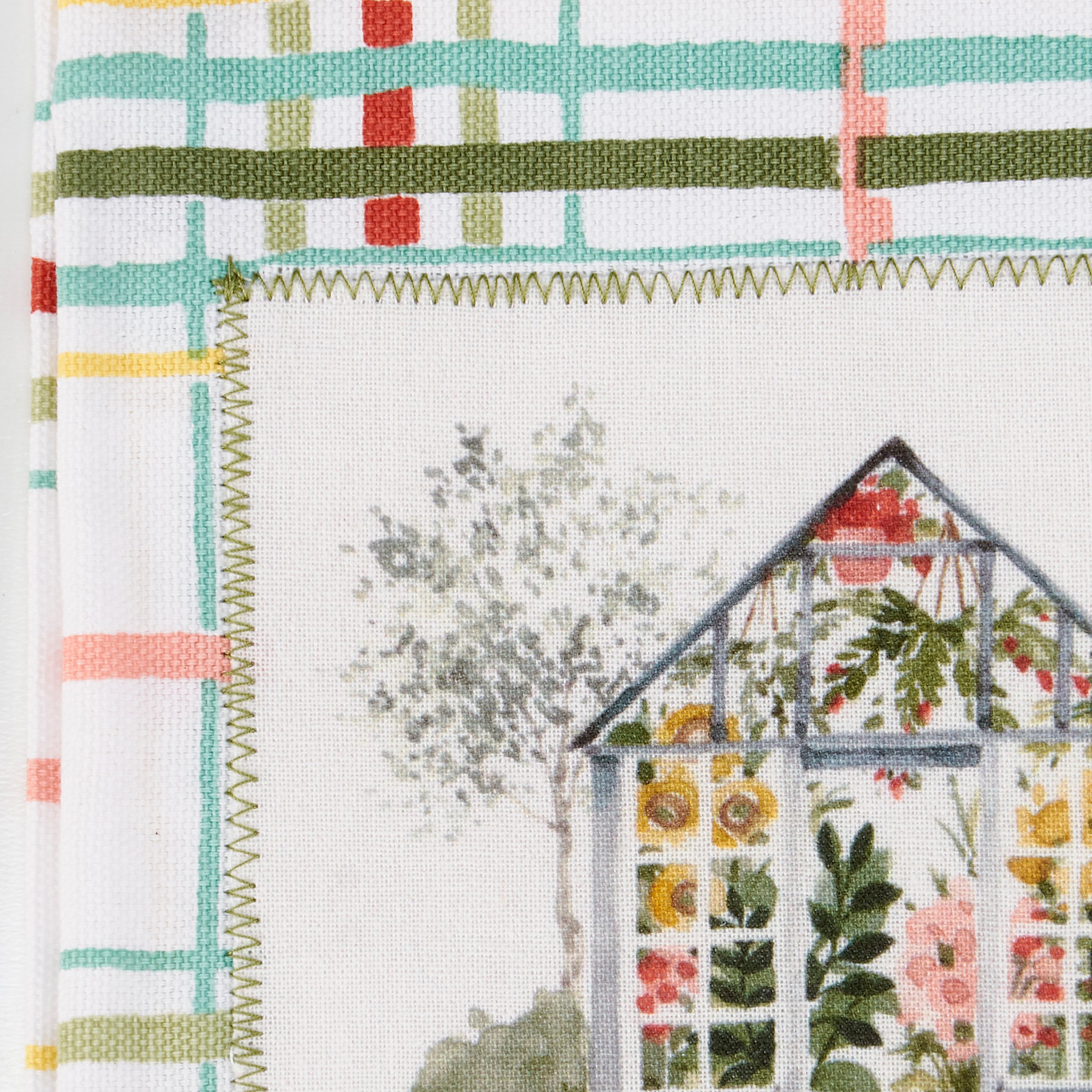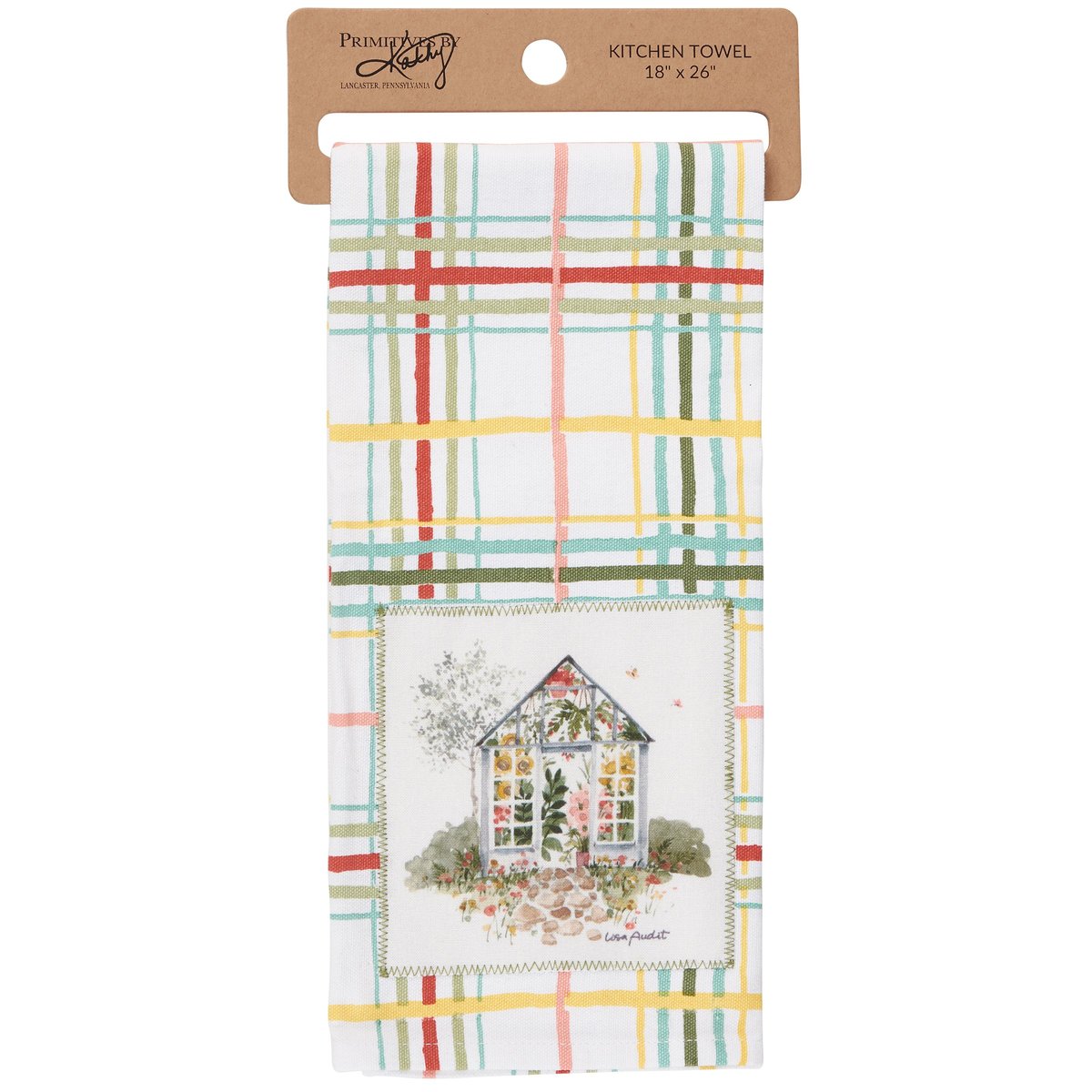 A cotton kitchen towel from our Botanical Collection featuring a stitched art panel and colorful plaid pattern all-over towel. Art panel displays a design of a greenhouse full of flowers and plants. Designs are replicated from original artwork hand painted in a delicate watercolor style. Our Greenhouse kitchen towel is conveniently machine-washable for easy cleaning. Packaged on a cardboard hanger with hole to easily hang on rack. A charming garden-themed kitchen accessory perfect for everyday use.