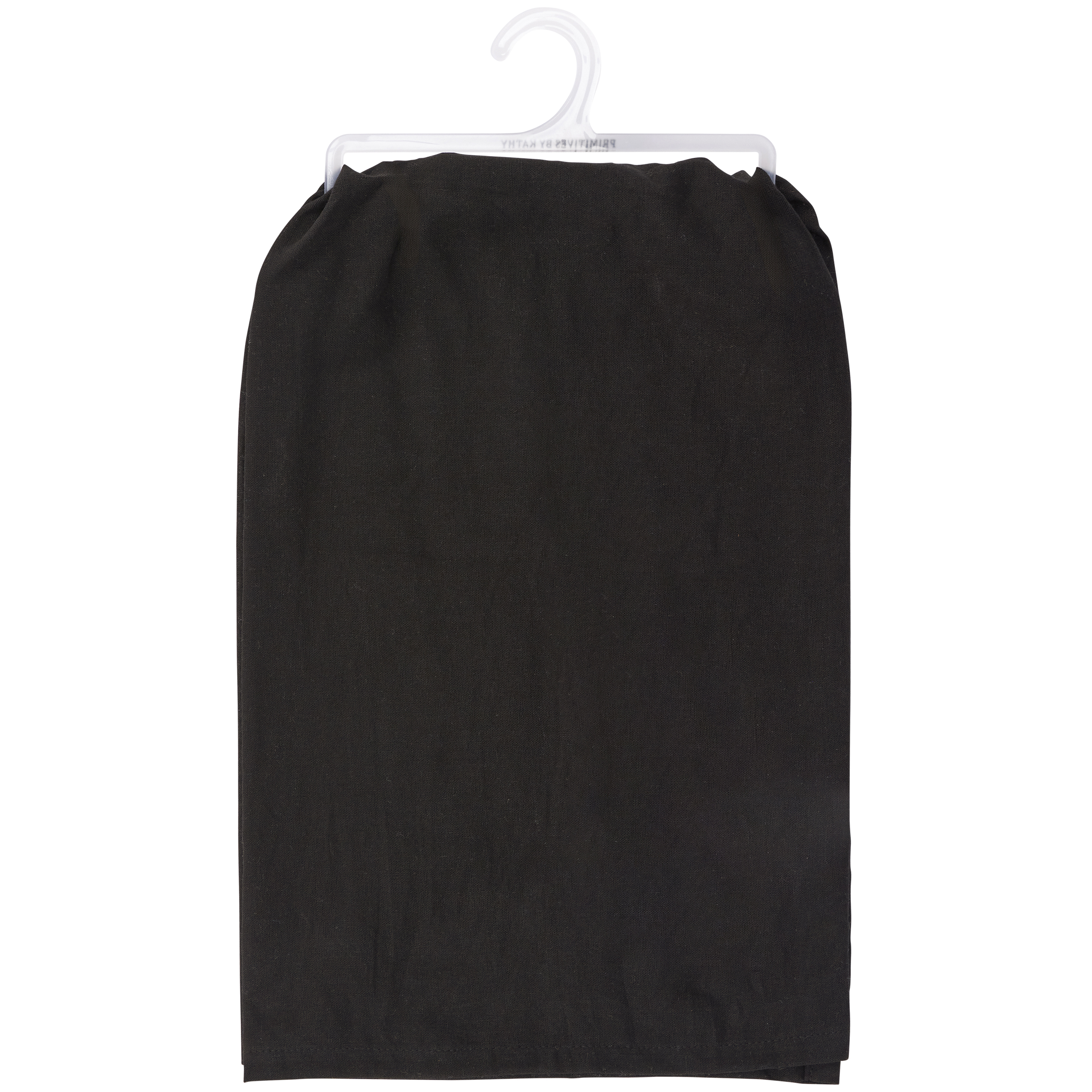 A black cotton kitchen towel from our Grilling & Chilling Collection displaying a fun grilling inspired sentiment with distressed details that reads "The Grill Master Lives Here With The Flame Of His Life." Our Grill Master kitchen towel is conveniently machine-washable for easy cleaning. Grill kitchen towel is packaged on a plastic hanger with hook to easily hang on rack for store display. A fun grill-themed gift perfect for everyday use.