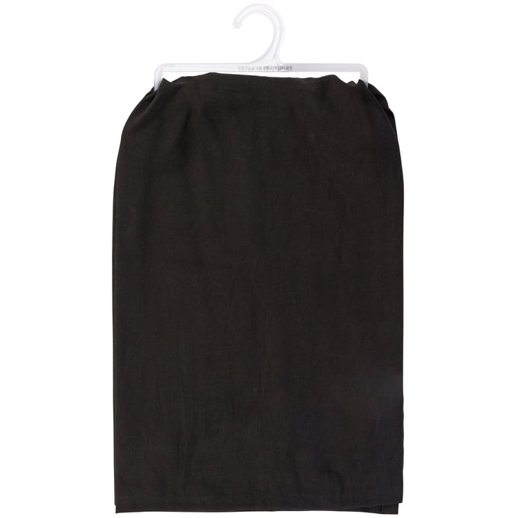 A black cotton kitchen towel from our Grilling & Chilling Collection displaying a fun grilling inspired sentiment with distressed details that reads "The Grill Master Lives Here With The Flame Of His Life." Our Grill Master kitchen towel is conveniently machine-washable for easy cleaning. Grill kitchen towel is packaged on a plastic hanger with hook to easily hang on rack for store display. A fun grill-themed gift perfect for everyday use.