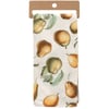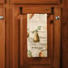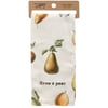 A cotton linen blend kitchen towel featuring all-over retro style pear designs and punny embroidered "Grow A Pear" sentiment. Features a cotton tape loop in the corner for easy hanging. Machine-washable. Towel is packaged on a cardboard hanger with a hole to easily hang on rack.