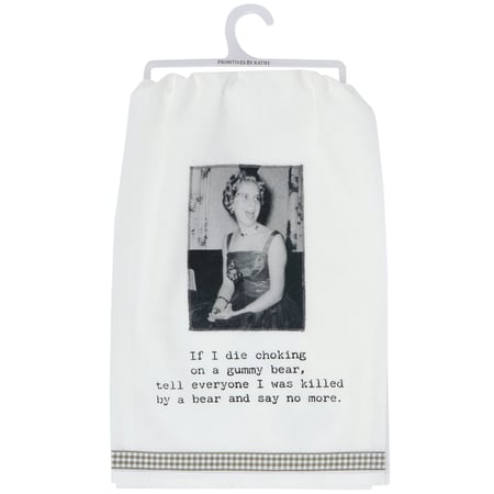 A white cotton kitchen towel from our Trash Talk By Annie Collection displaying a vintage black and white photograph on a stitched art panel complemented with a humorous sentiment that reads "If I Die Choking On A Gummy Bear, Tell Everyone I Was Killed By A Bear And Say No More." Funny kitchen towel also features a gray gingham ribbon along the bottom. Our Gummy Bear kitchen towel is conveniently machine-washable for easy cleaning. Kitchen towel is packaged on a clear plastic hanger to easily display on rack. A fun vintage style kitchen accessory great for everyday gifting.