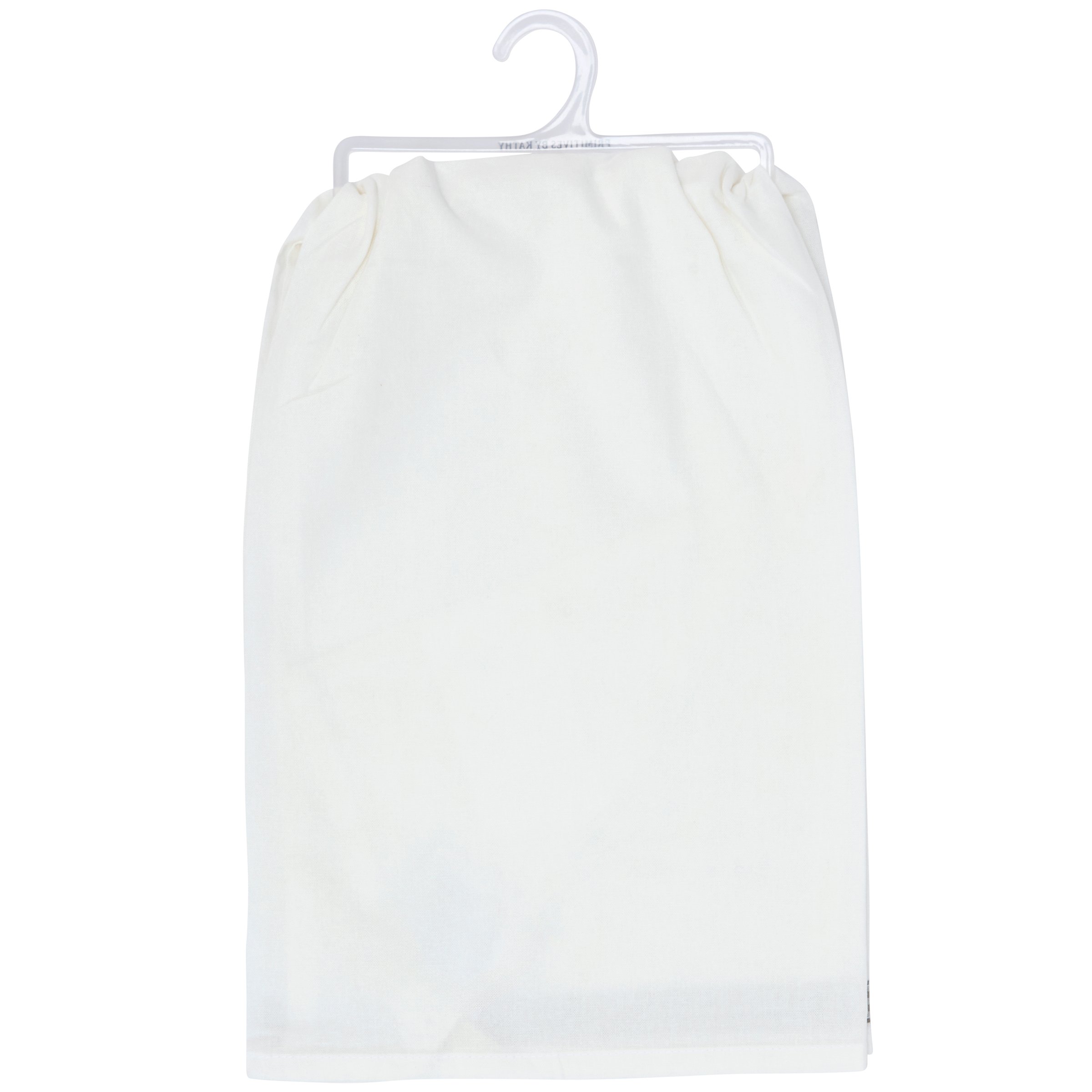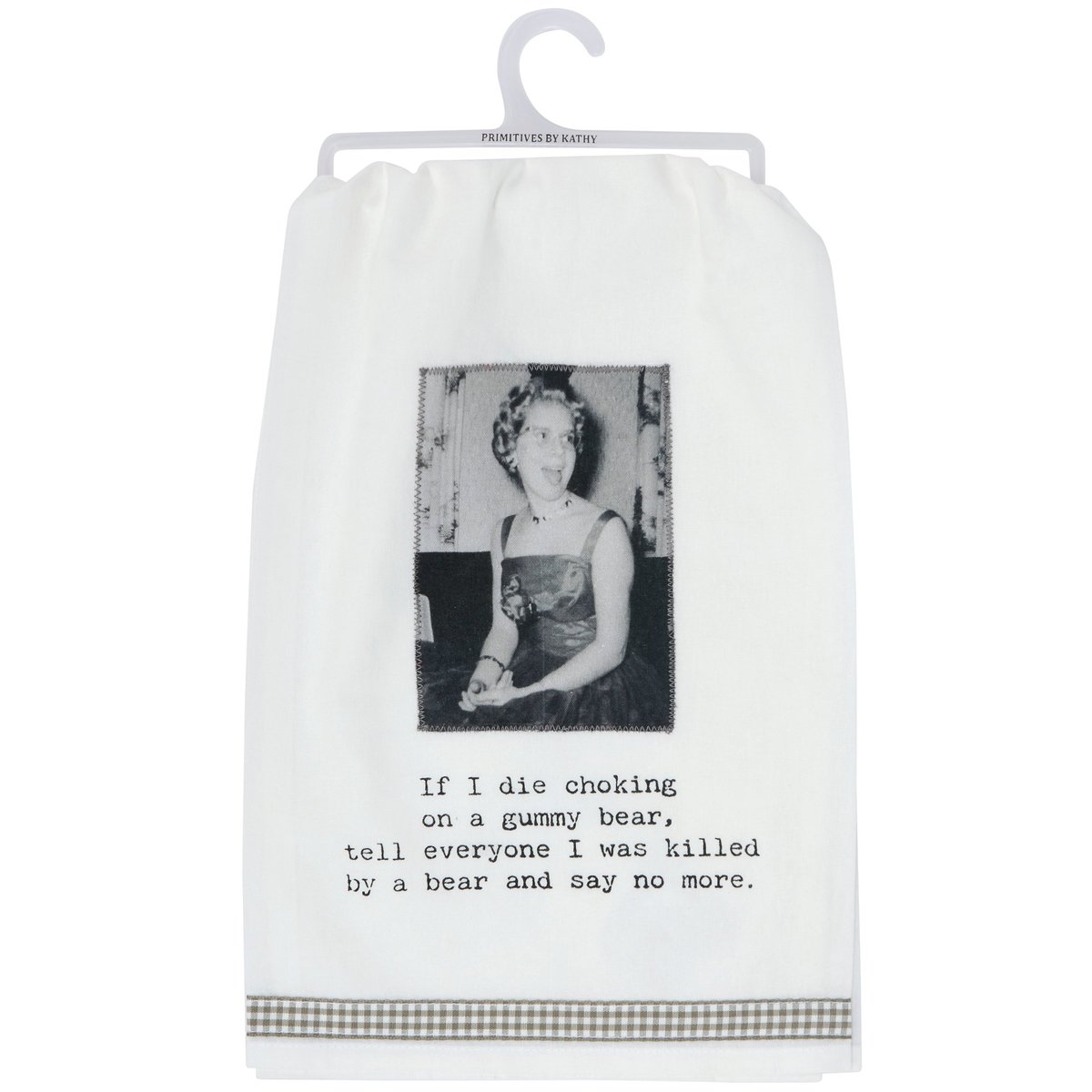 A white cotton kitchen towel from our Trash Talk By Annie Collection displaying a vintage black and white photograph on a stitched art panel complemented with a humorous sentiment that reads "If I Die Choking On A Gummy Bear, Tell Everyone I Was Killed By A Bear And Say No More." Funny kitchen towel also features a gray gingham ribbon along the bottom. Our Gummy Bear kitchen towel is conveniently machine-washable for easy cleaning. Kitchen towel is packaged on a clear plastic hanger to easily display on rack. A fun vintage style kitchen accessory great for everyday gifting.