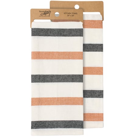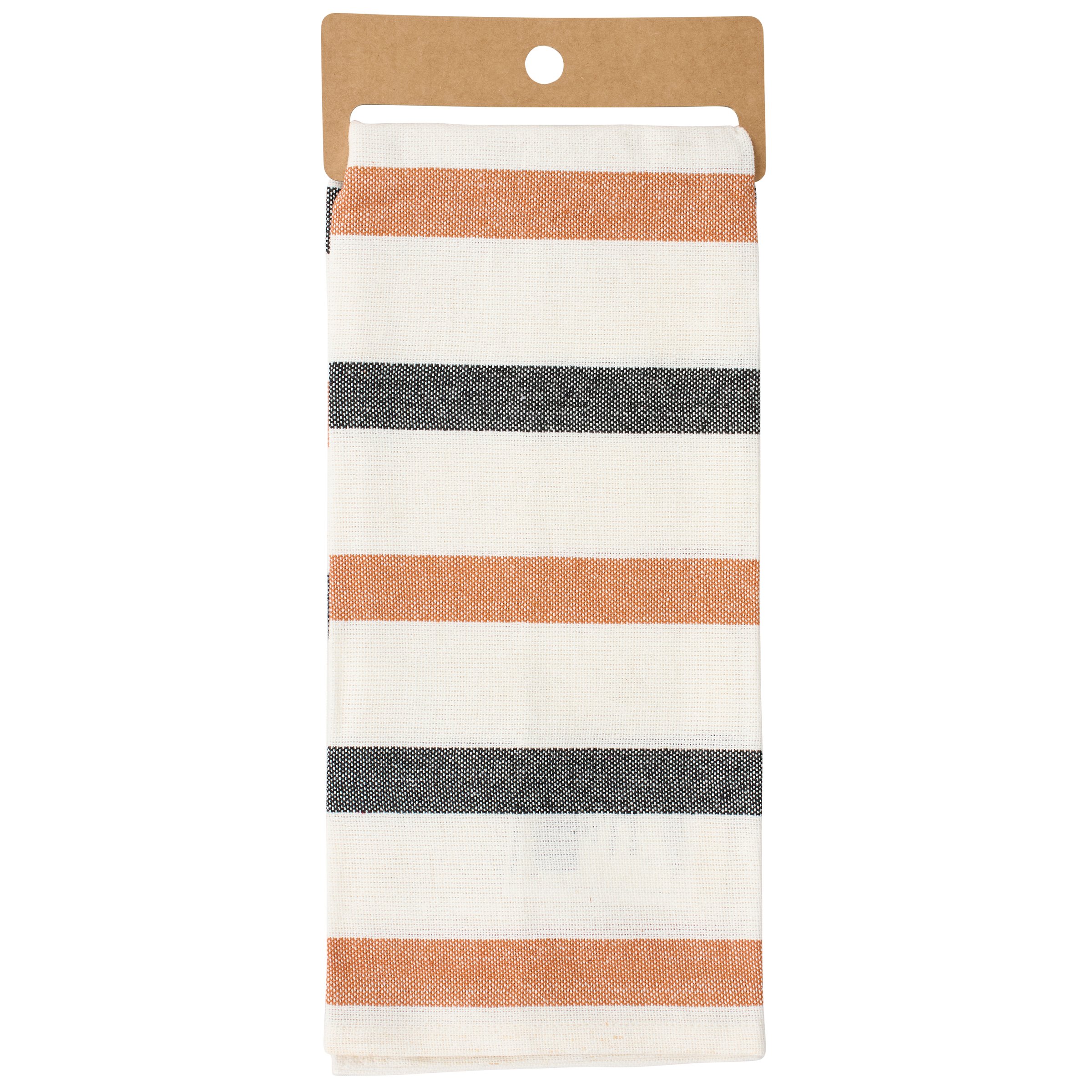 A cotton kitchen towel from our Halloween Collection displaying an all-over design of woven black and orange stripes that coordinates well with Halloween home decor. Our Halloween Stripe kitchen towel is conveniently machine washable for easy cleaning. Seasonal kitchen towel is packaged on a cardboard hanger with hole to easily display on rack. A Halloween kitchen accessory perfect for adding seasonal style to any kitchen.
