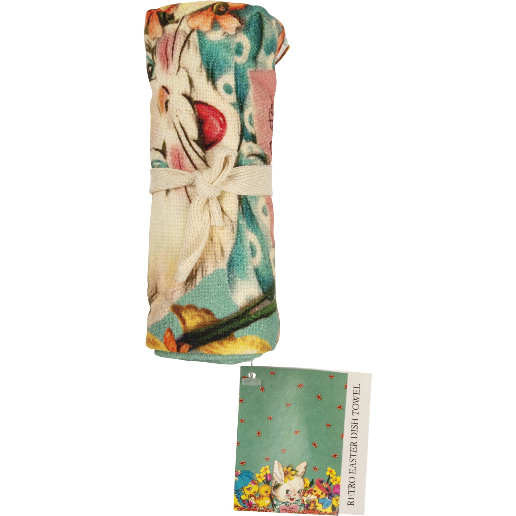 A cotton kitchen towel featuring an all-over floral design and retro Easter animal designs with "Happy Easter To You" sentiment. Towel is woven with textured slub fabric and features cotton tape loop in corner for hanging. Machine-washable.