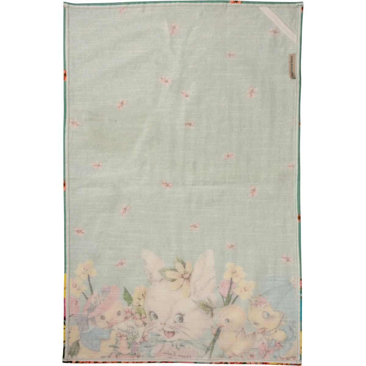 A cotton kitchen towel featuring an all-over floral design and retro Easter animal designs with "Happy Easter To You" sentiment. Towel is woven with textured slub fabric and features cotton tape loop in corner for hanging. Machine-washable.