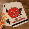 A vintage-inspired cotton kitchen towel from our Halloween Collection featuring a "Happy Halloween" sentiment, Jack-o'lantern design, velvet ribbon trim, and black cat print throughout.Our Happy Halloween garden flag is machine-washable.