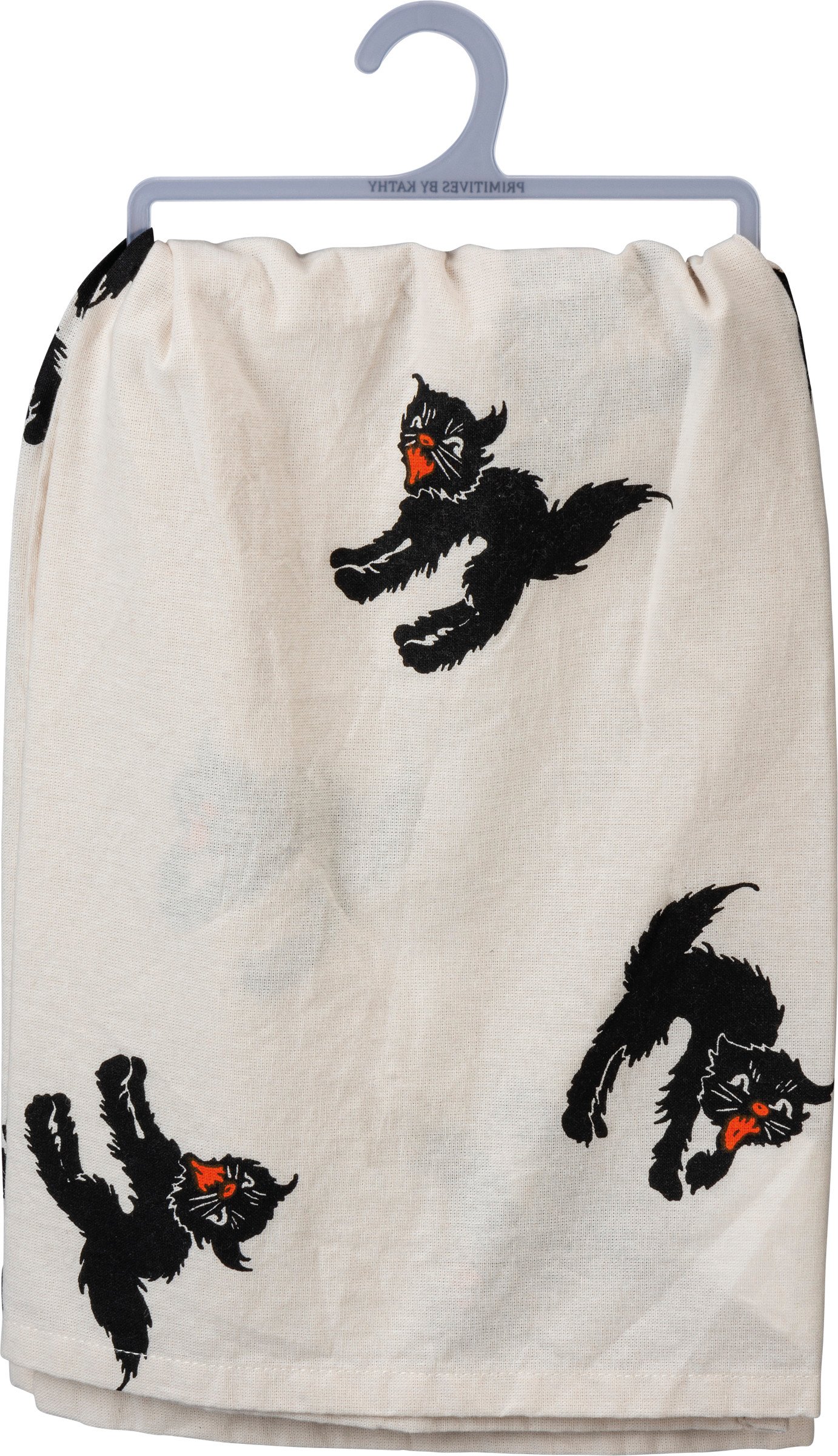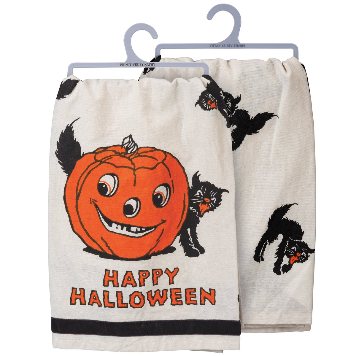 A vintage-inspired cotton kitchen towel from our Halloween Collection featuring a "Happy Halloween" sentiment, Jack-o'lantern design, velvet ribbon trim, and black cat print throughout.Our Happy Halloween garden flag is machine-washable.