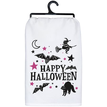 A black & white cotton kitchen towel from our Halloween Collection displaying unique hand illustrated designs of Halloween motifs with purple accents and a seasonal sentiment that reads "Happy Halloween." Our Happy Halloween kitchen towel is conveniently machine-washable for easy cleaning. Seasonal kitchen towel is packaged on a black plastic hanger to easily display on rack. A fun Halloween kitchen accessory perfect for seasonal use.